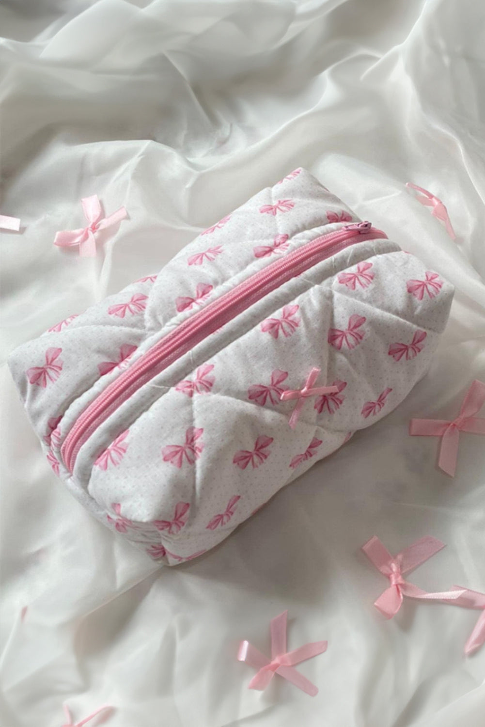Pink Bow Knot Quilted Zipper Makeup Bag