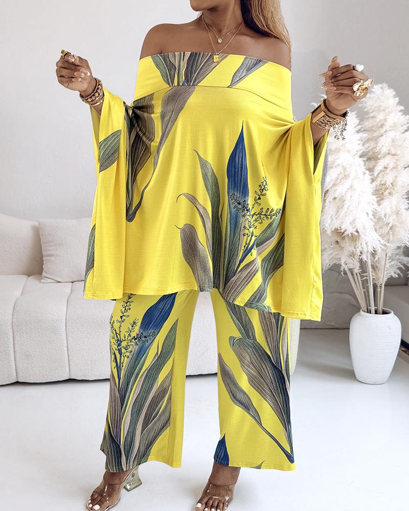 2 Pieces Outfit Abstract Print Cold Shoulder Batwing Sleeve Top and Casual Wide Leg Pants Set