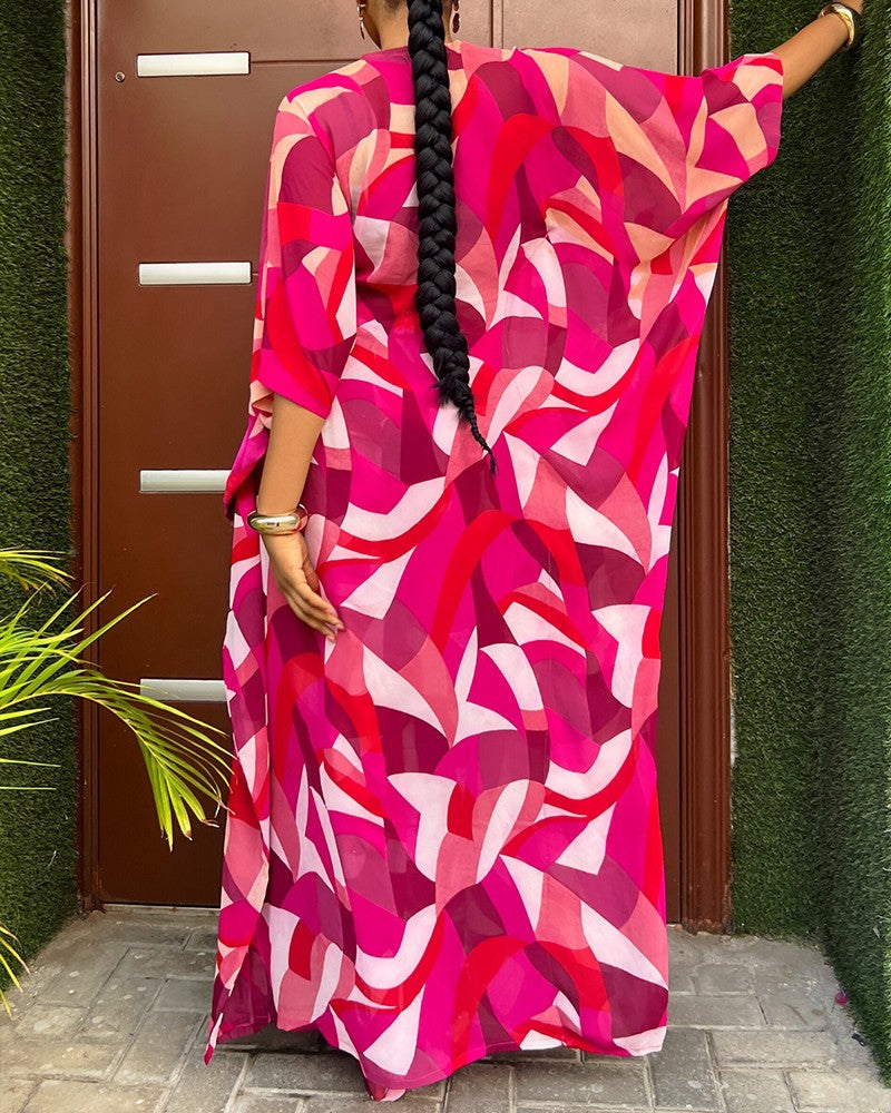 2 Pieces Outfit Colorblock Geometric Print Batwing Sleeve Cover Up and Casual Wide Leg Pants Set