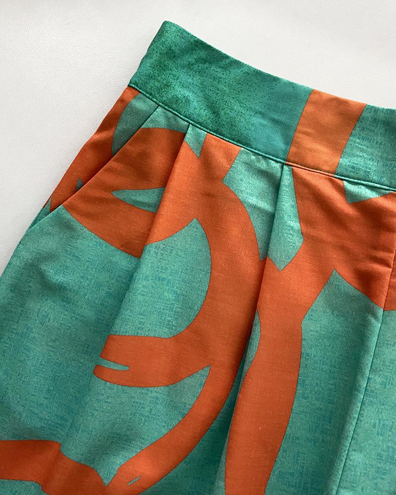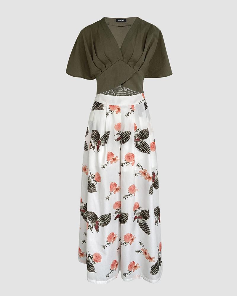2 Pieces Outfit Plain V Neck Short Sleeve Ruched Top and Casual Floral Print Wide Leg Pants Set