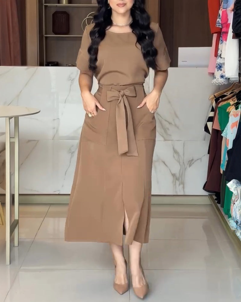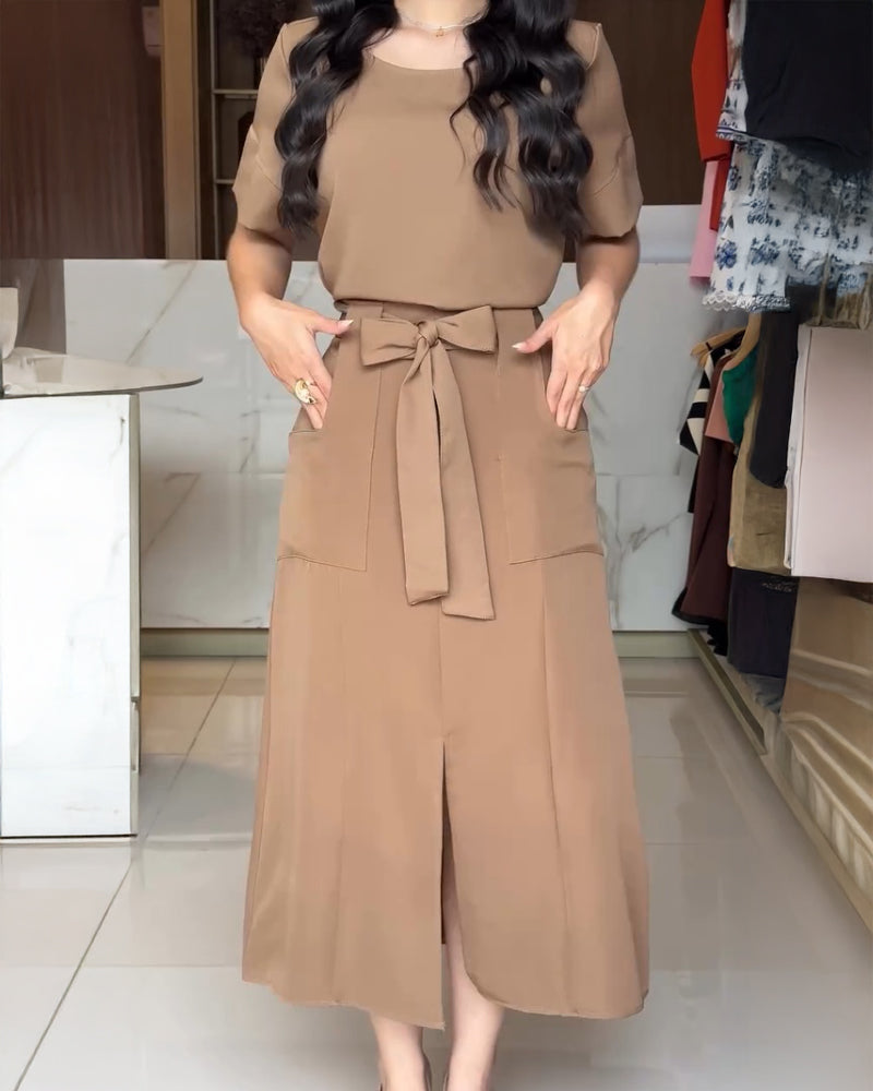 2 Pieces Outfit Round Neck Short Sleeve Top and High Waist Slit Skirt Set With Pockets