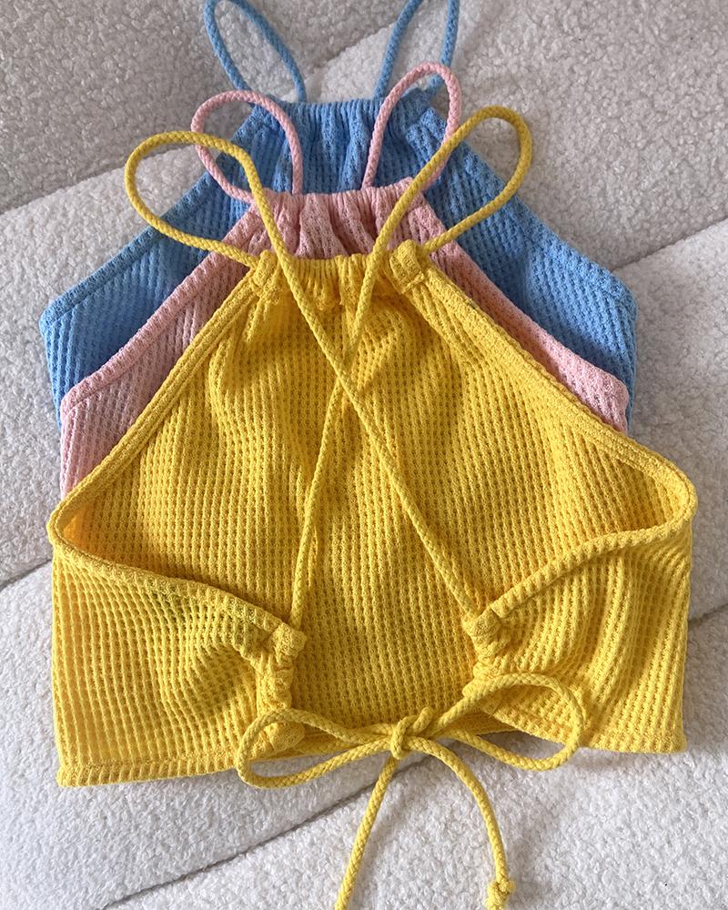2 Pieces Outfit Striped Print Halter Tied Detail Sleeveless Knit Top and Casual Slim Fit Pants Set