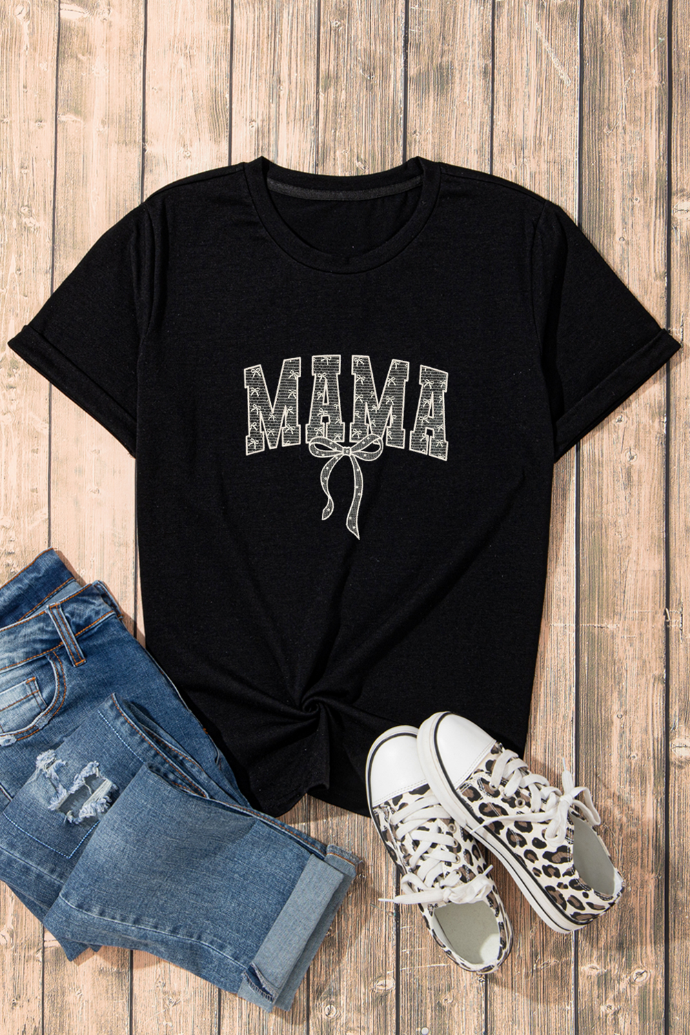 Black Bowknot MAMA Embroidered Crewneck Mothers Day T Shirt
