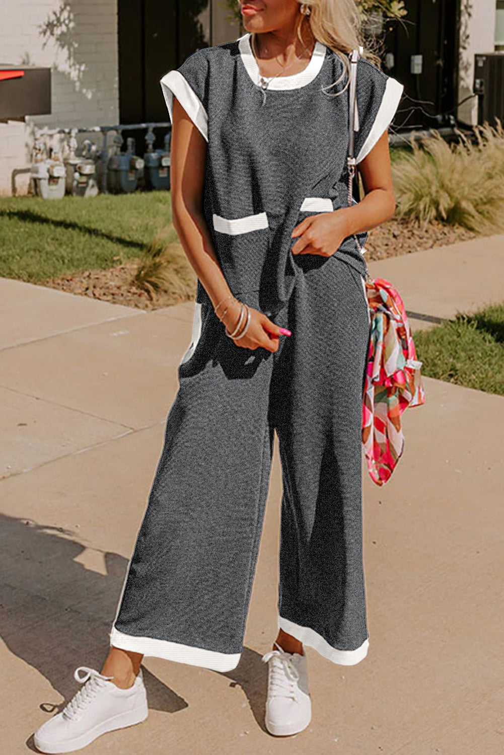 Navy Blue Color Block Pocketed T Shirt and Wide Leg Pants Set