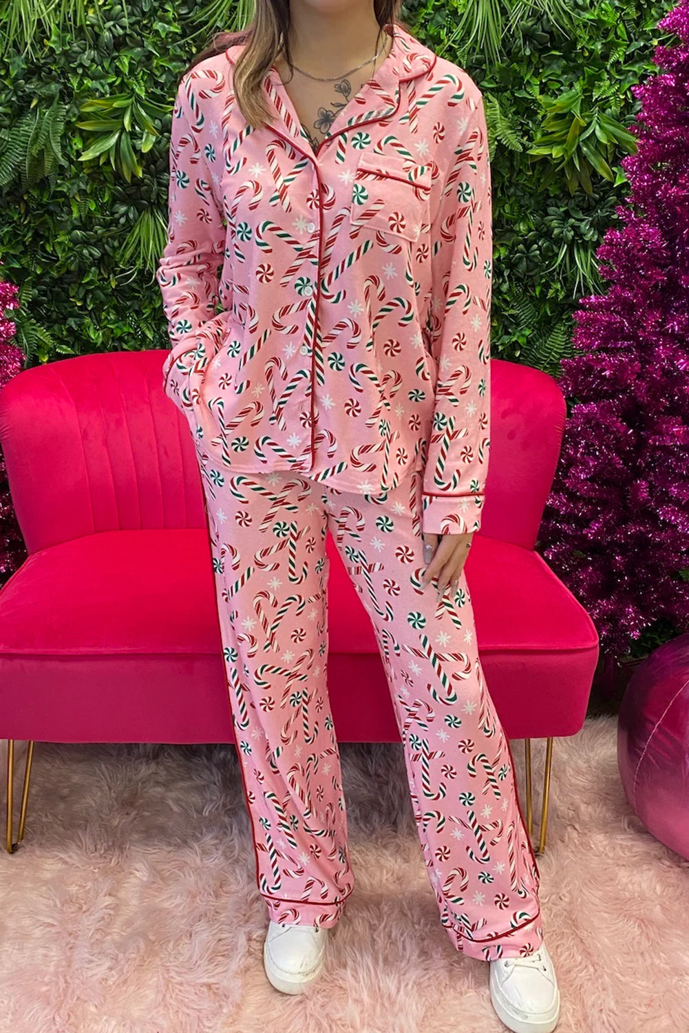 Pink Christmas Candy Cane Print Pocketed Knotted Pajama Set