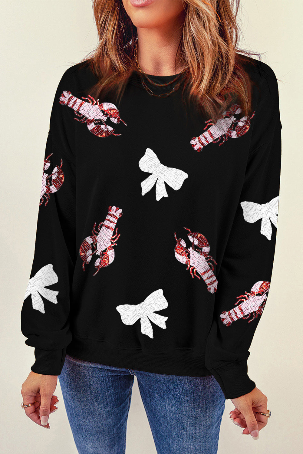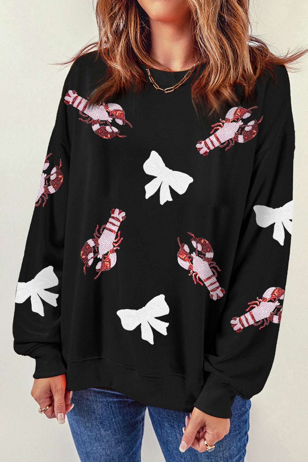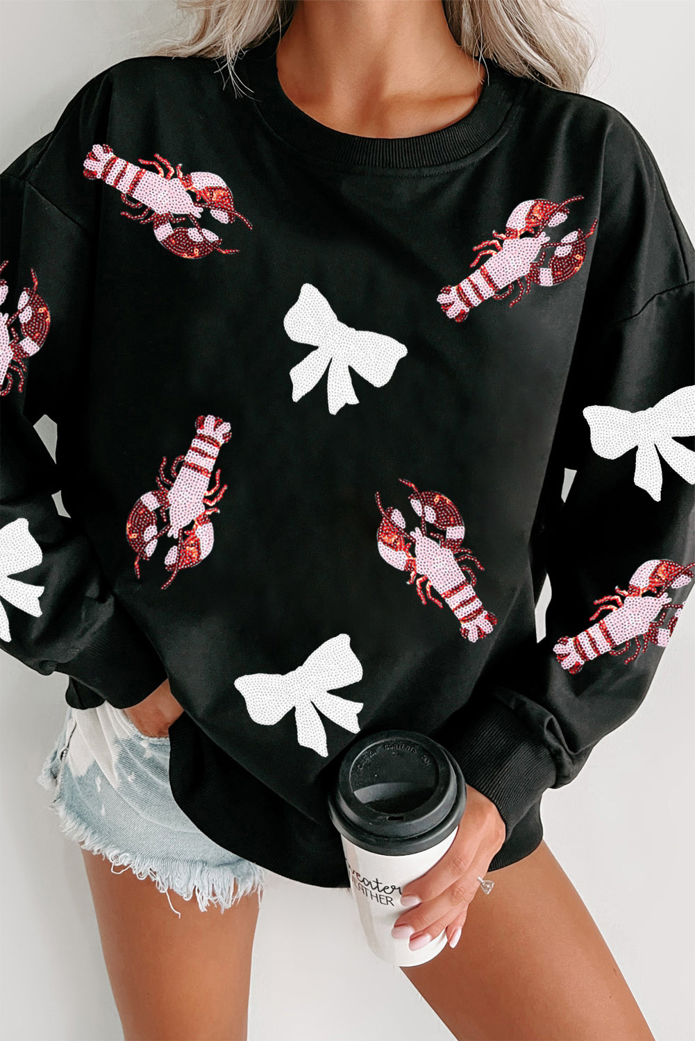 Black Crawfish Bow Sequin Patched Graphic Sweatshirt