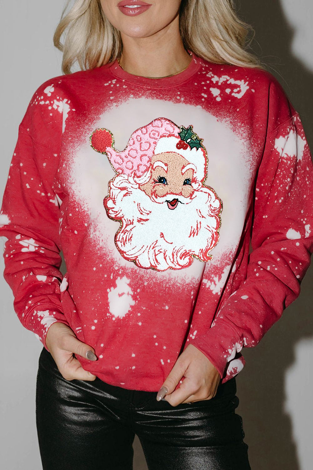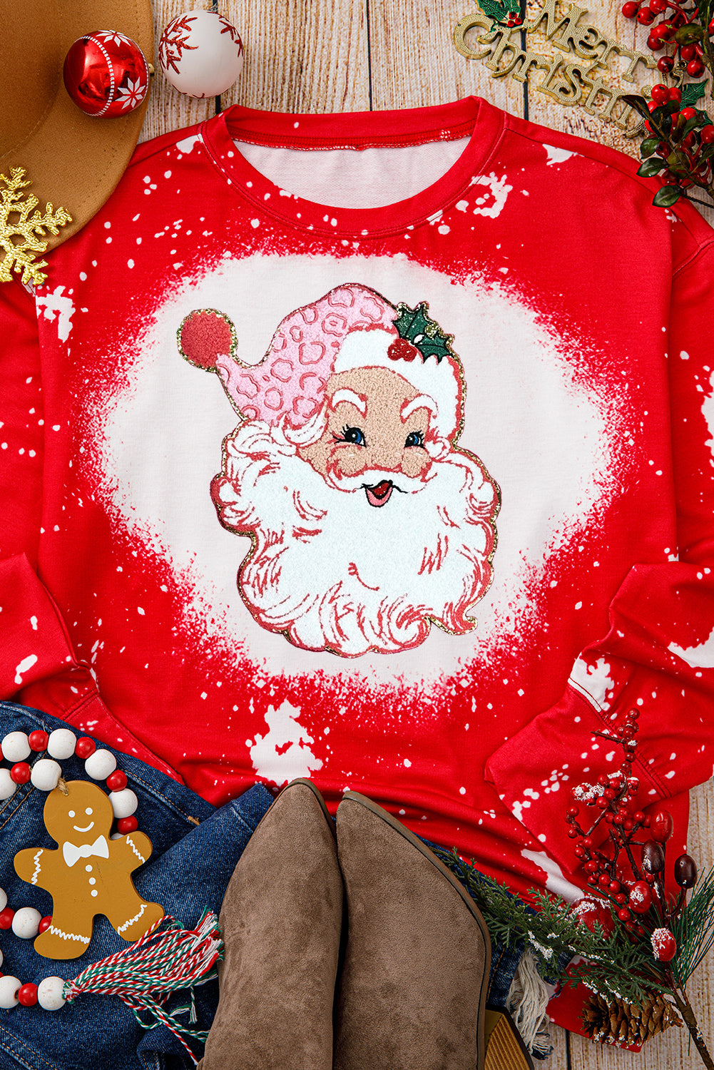 Fiery Red Santa Claus Tie Dye Printed Crewneck Long Sleeve Top