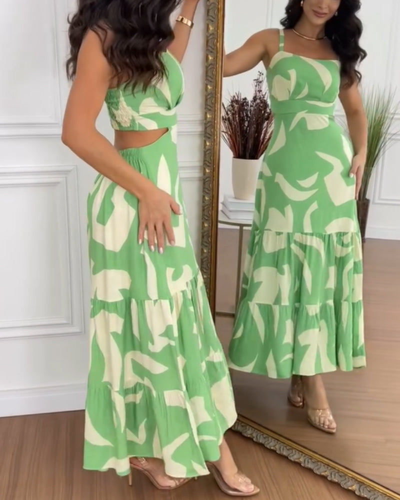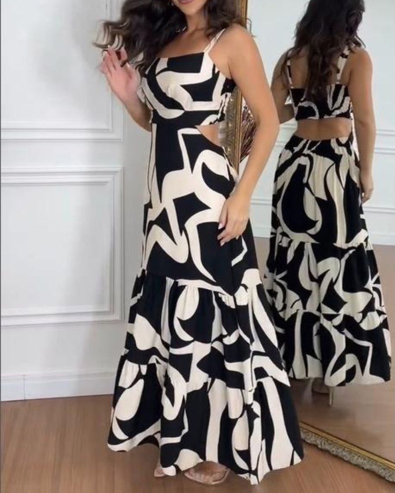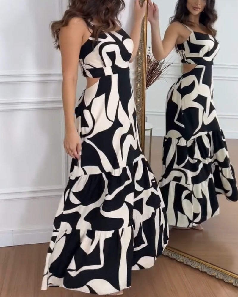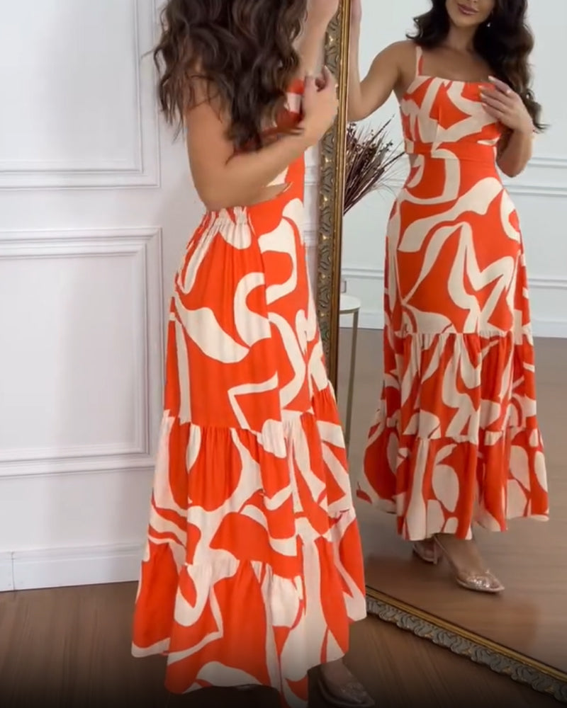Abstract Print Spaghetti Strap Maxi Dress Casual Hollow Out Ruffles Hem Dress