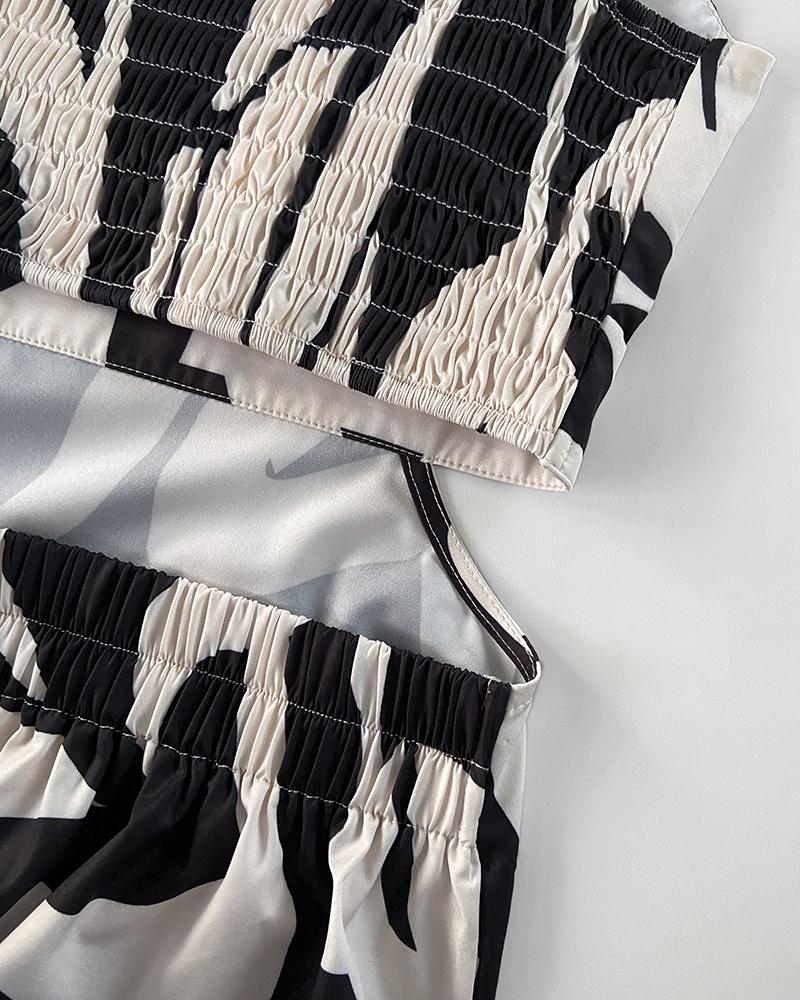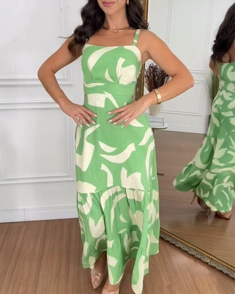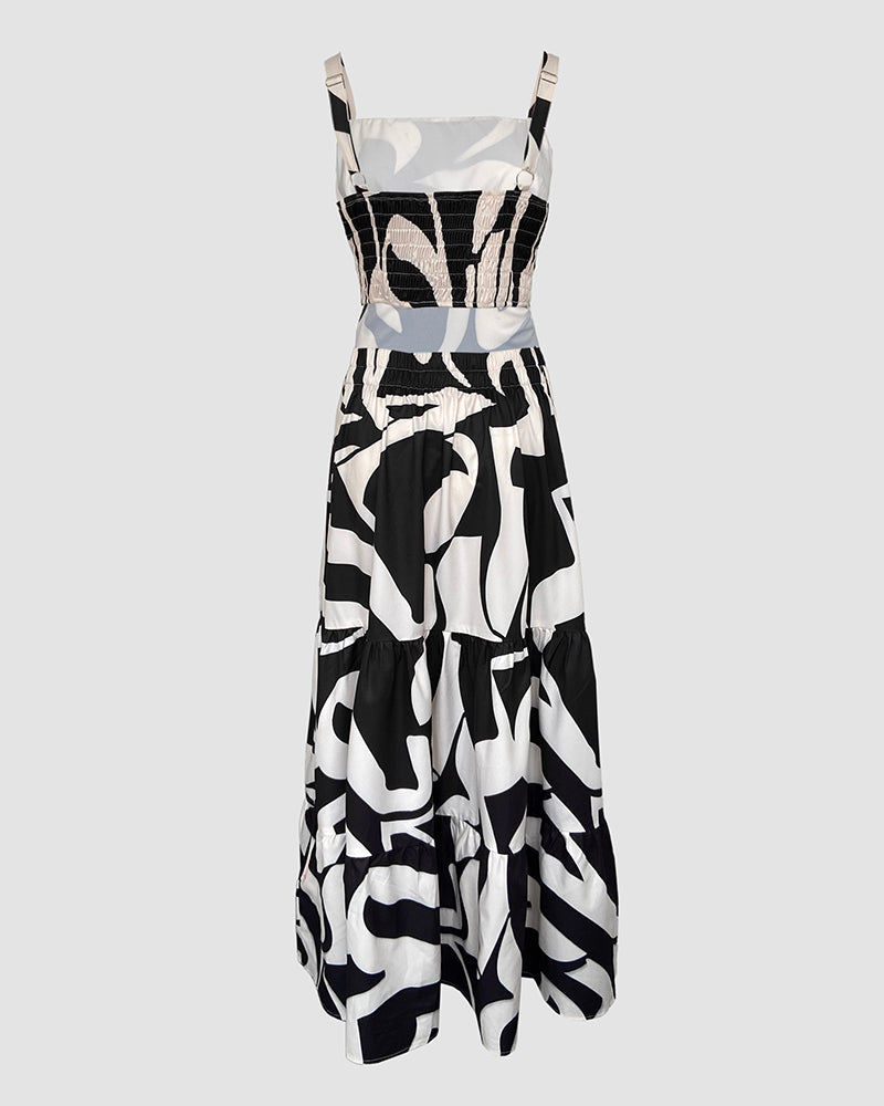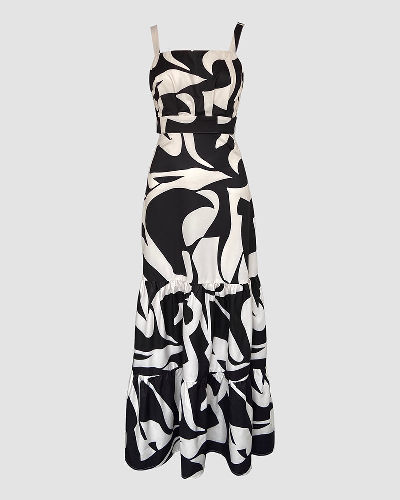 Abstract Print Spaghetti Strap Maxi Dress Casual Hollow Out Ruffles Hem Dress