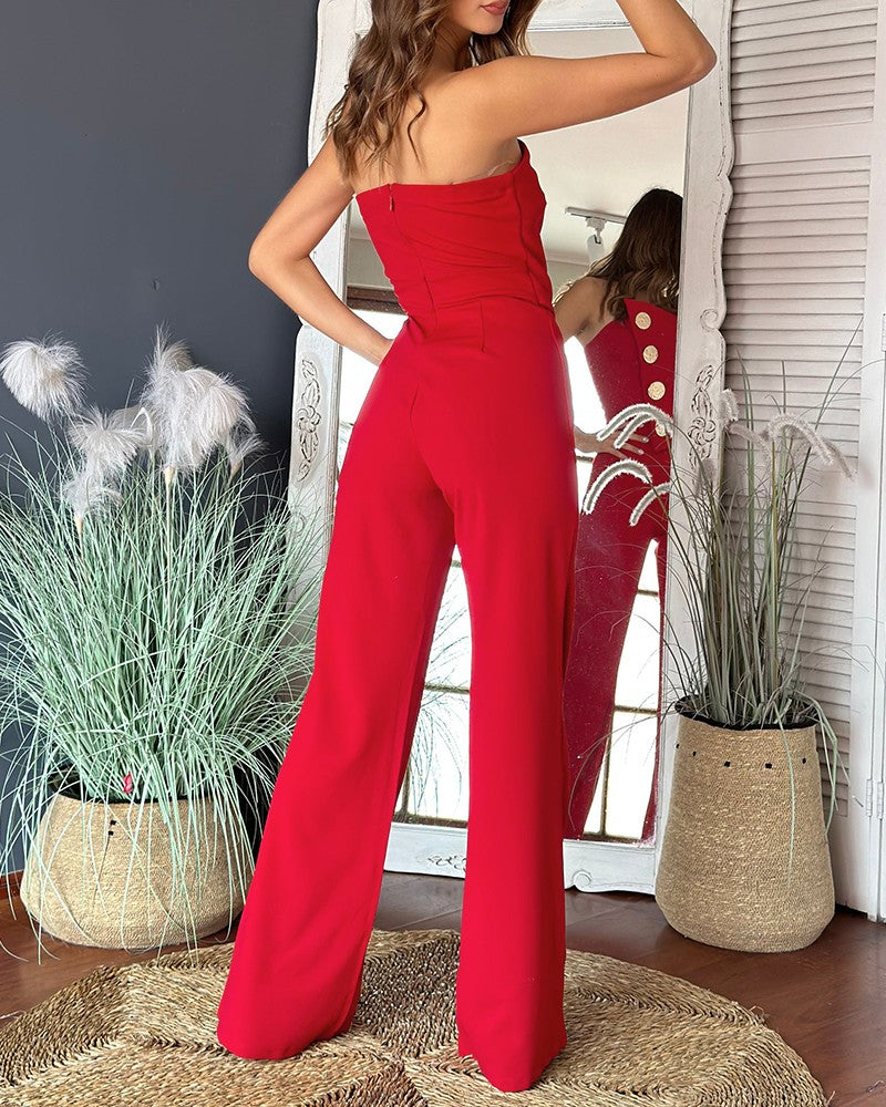 Asymmetrical Bandeau Strapless Jumpsuit Metal Button Decor Casual Overalls