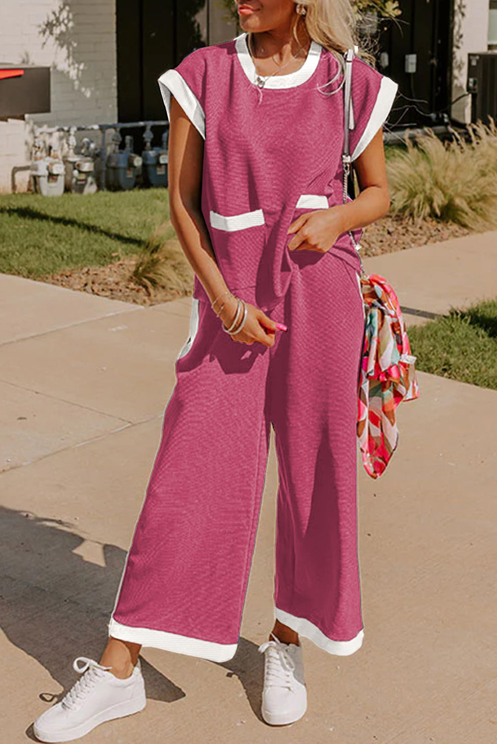 Black Color Block Pocketed T Shirt and Wide Leg Pants Set