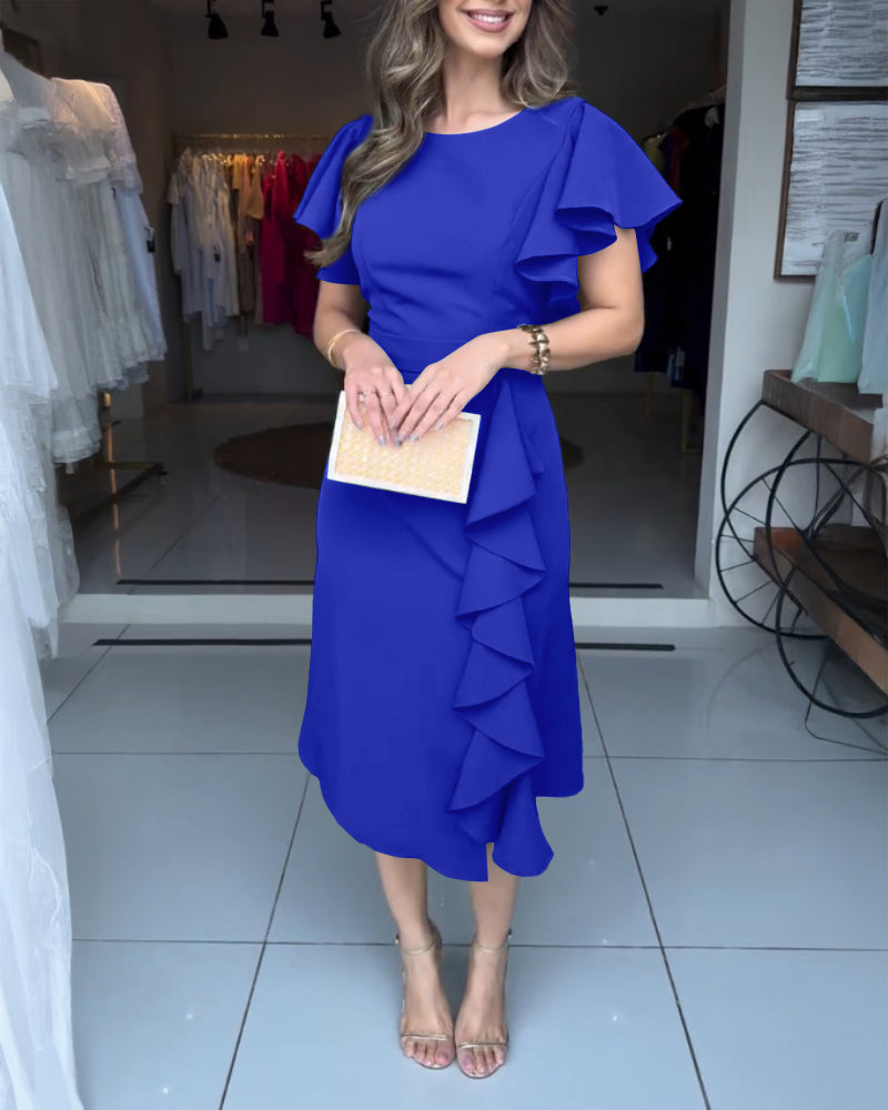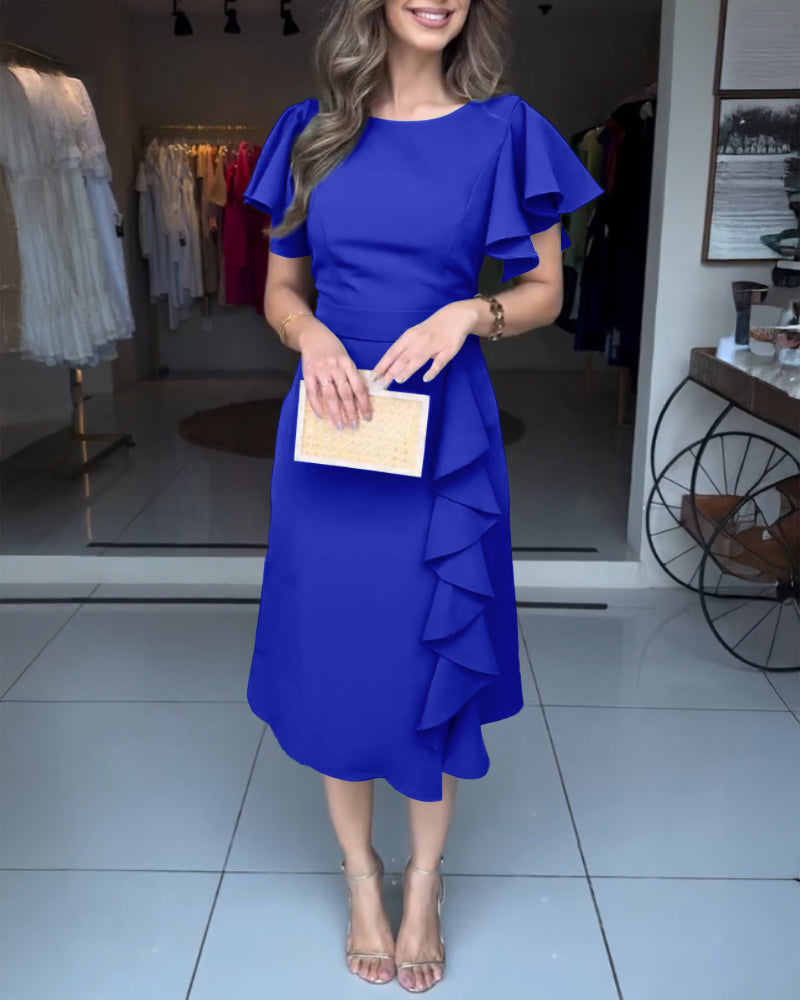 Butterfly Sleeve Ruffles Design Cinched Waist Work Dress Zipper Back Slim Fit Slit Mid Length Dress