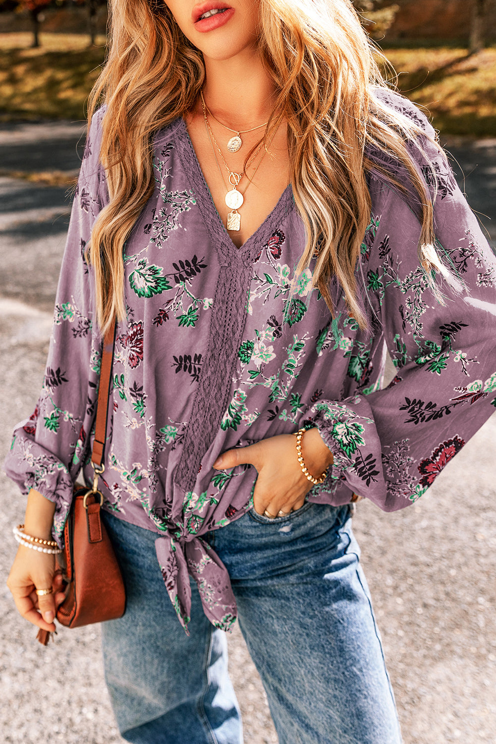 Sky Blue Floral Print Lace Patchwork Knot Front V Neck Blouse