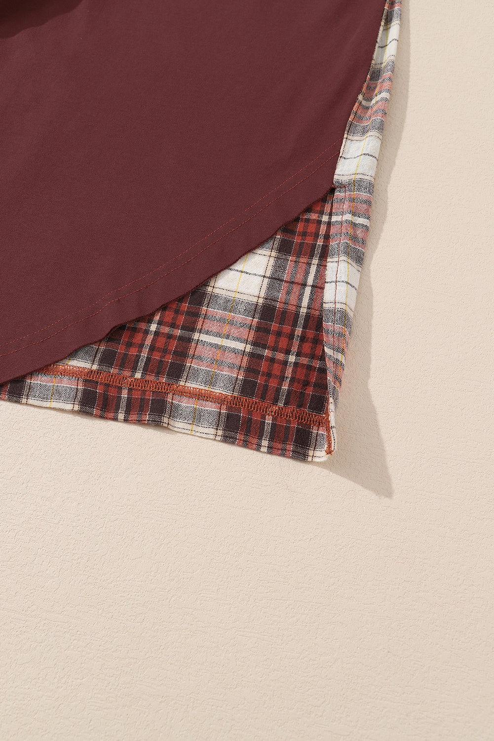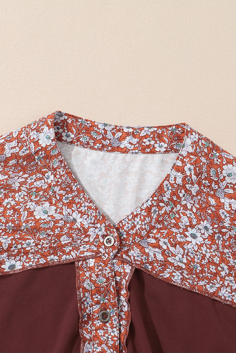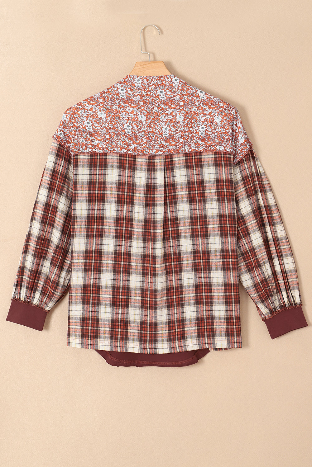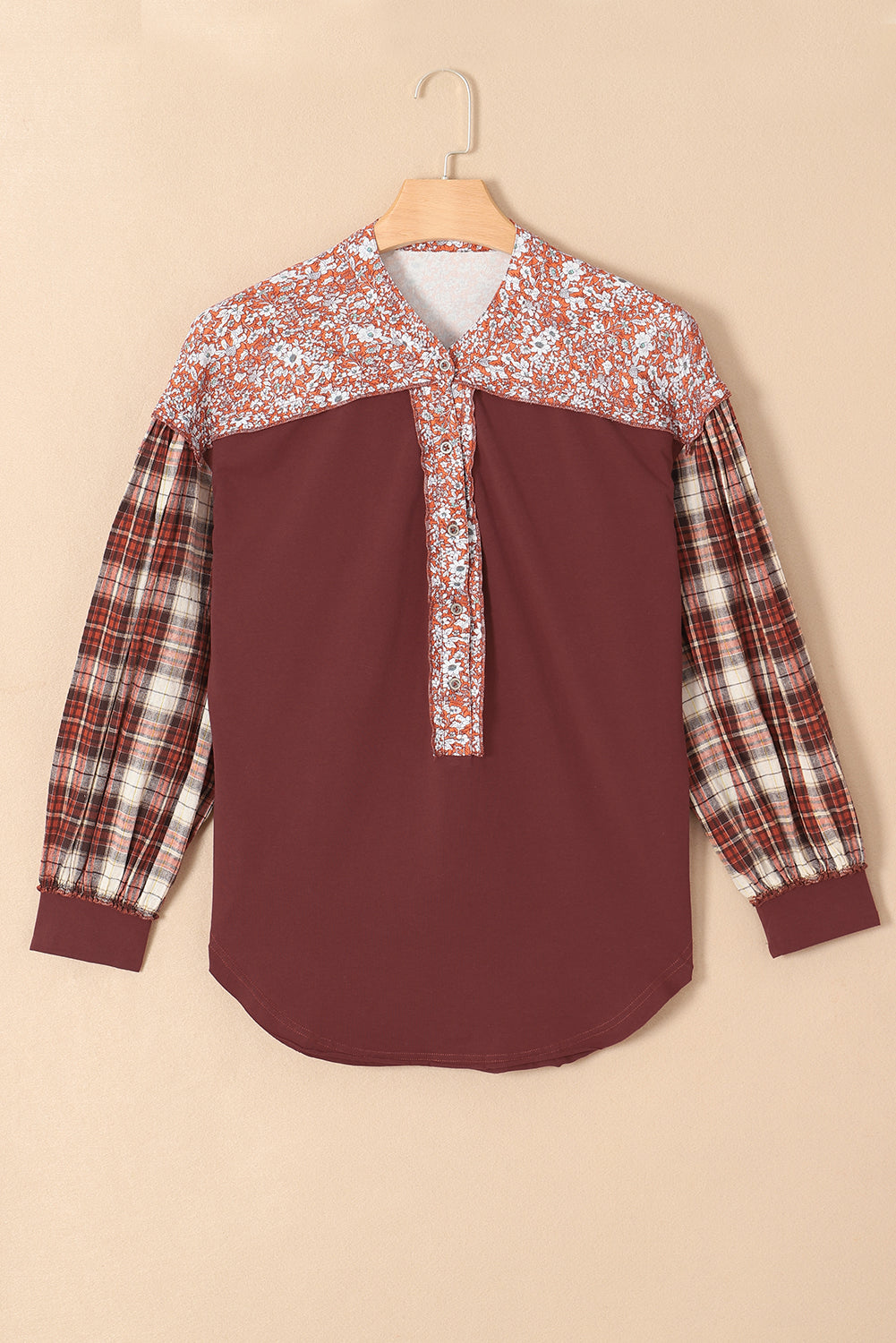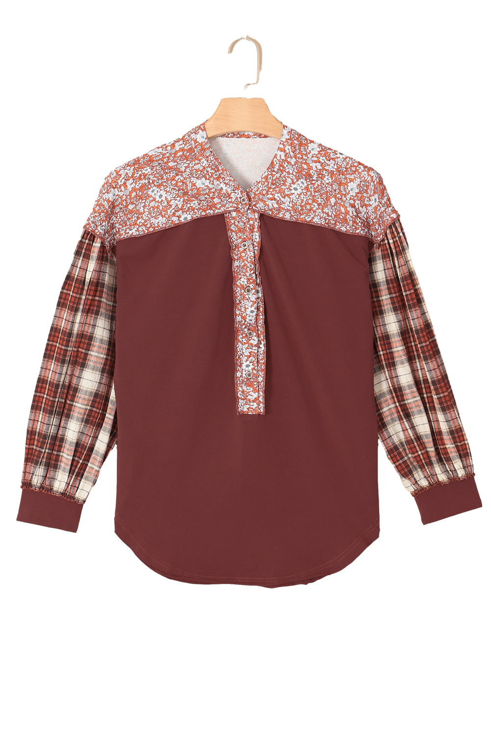 Fiery Red Floral Plaid Mixed Print Bishop Sleeve Patchwork Top