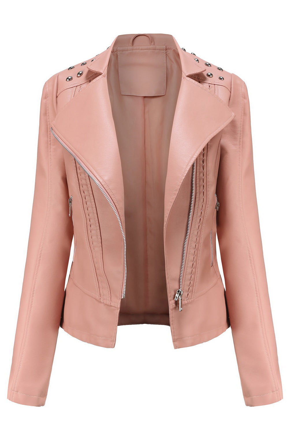 Gossamer Pink Faux Leather Studded Shoulder Asymmetric Zip Jacket