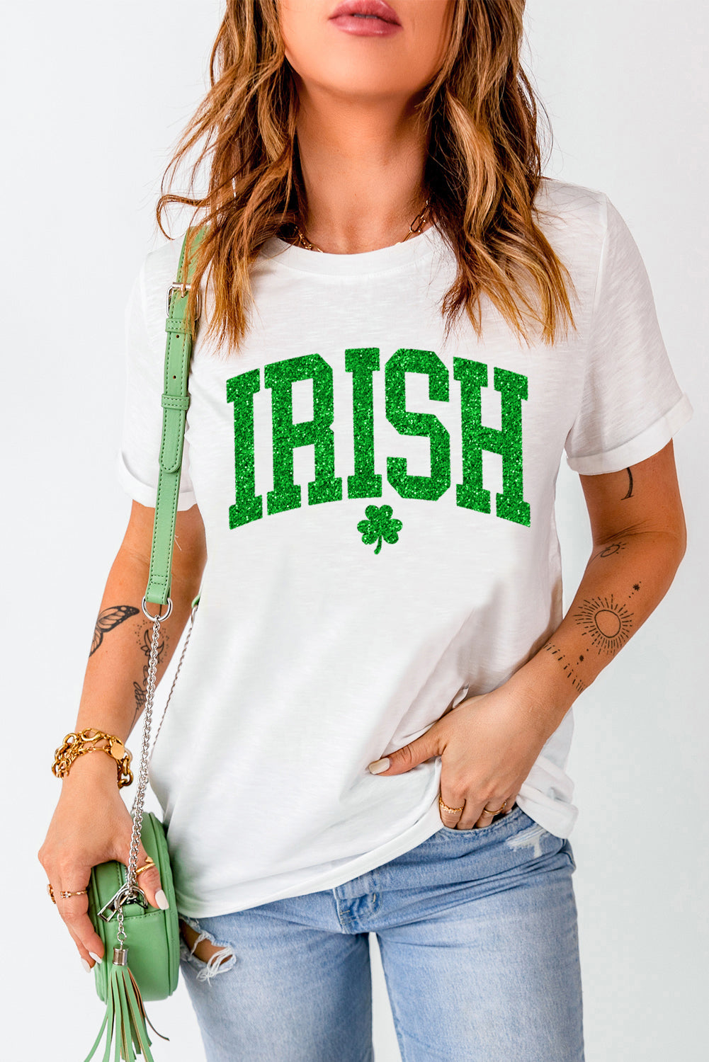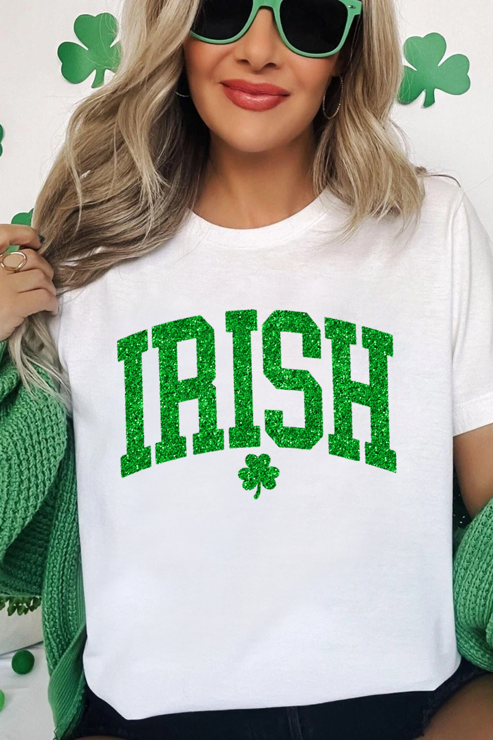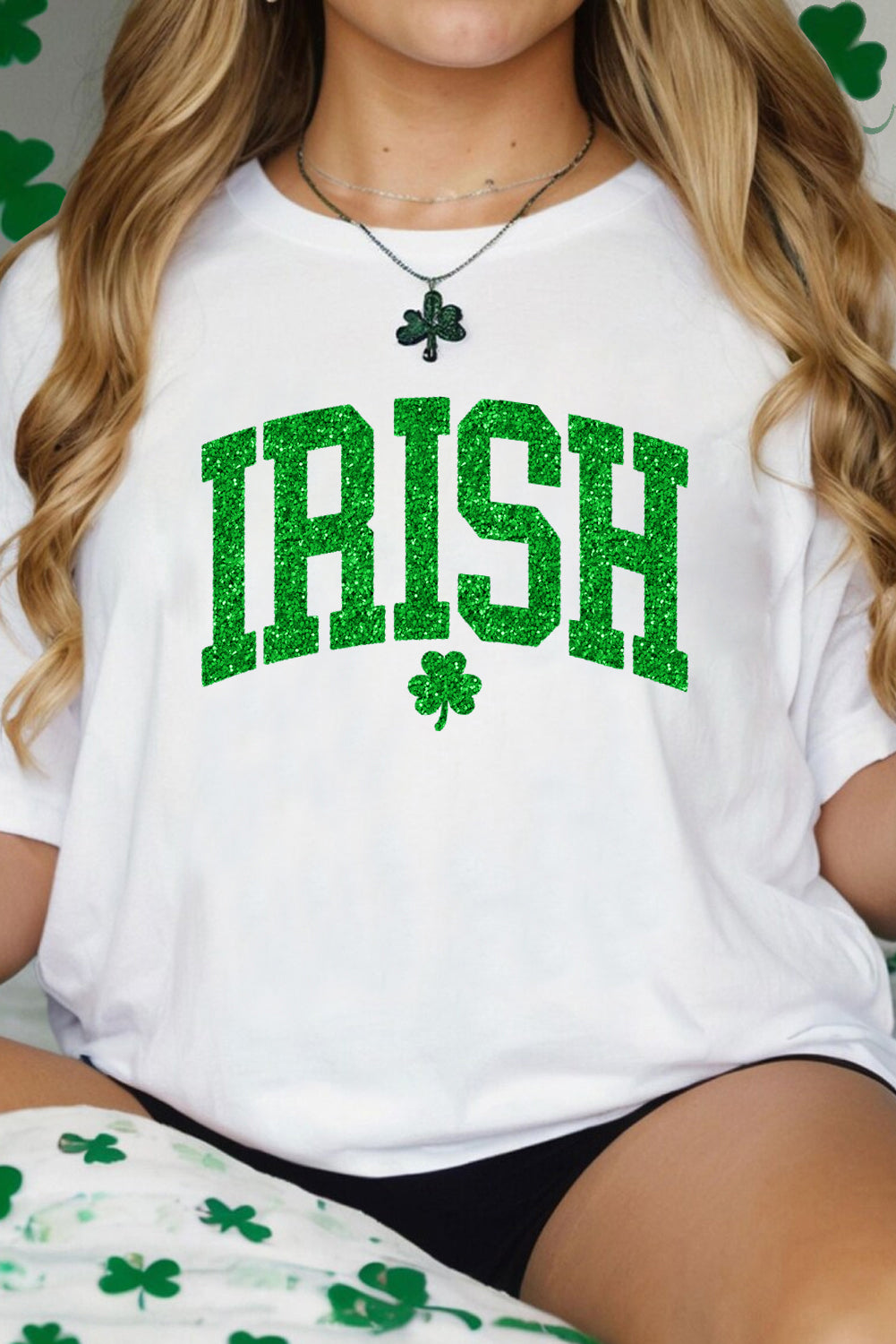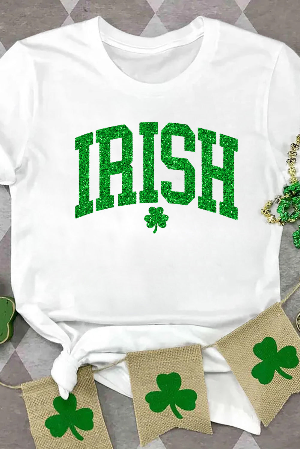 White IRISH Clover Glitter Printed St Patricks T Shirt