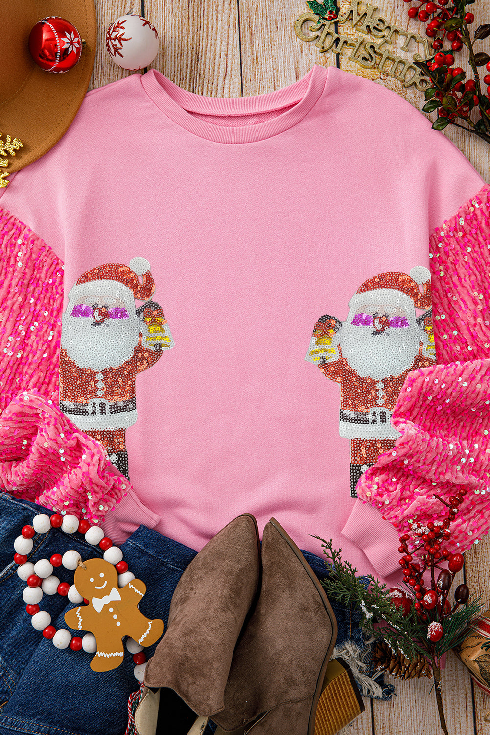 Pink Double Santa Claus Christmas Sequin Long Sleeve Top