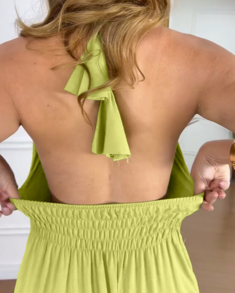 Halter Sleeveless Backless Maxi Dress Casual Shirred Back Side Slit Vacation Dress