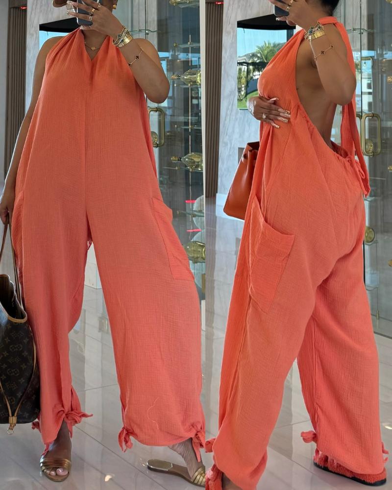 Halter Sleeveless Cuffed Lace Up Backless Jumpsuit Casual Pocket Design Romper