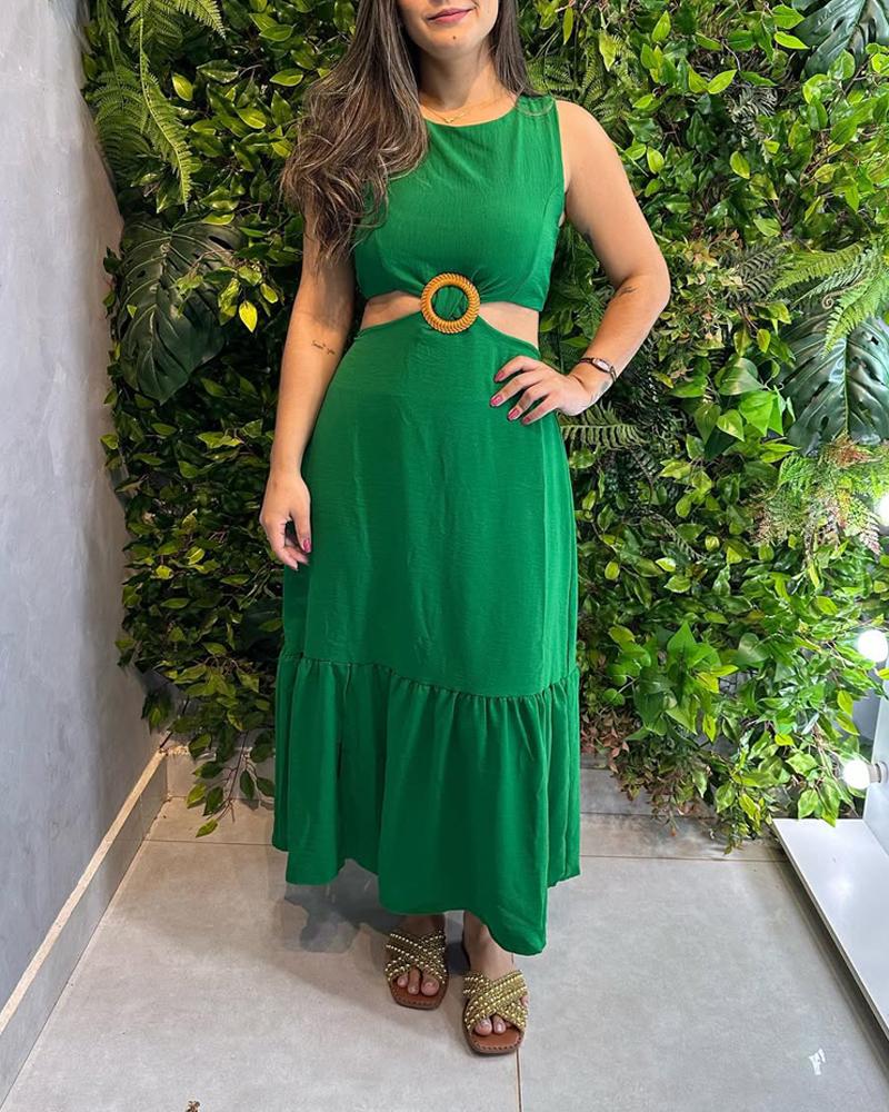 Halter Sleeveless Waist Cutout Maxi Dress Sexy Hoop Decor A Line Smocked Dress