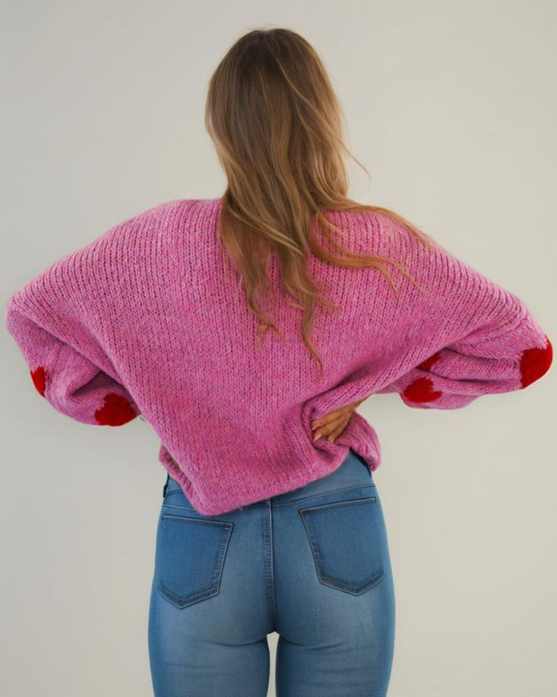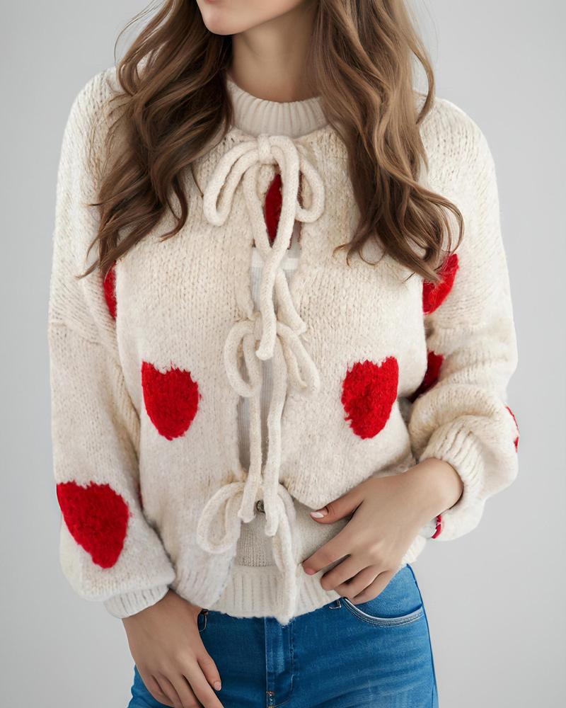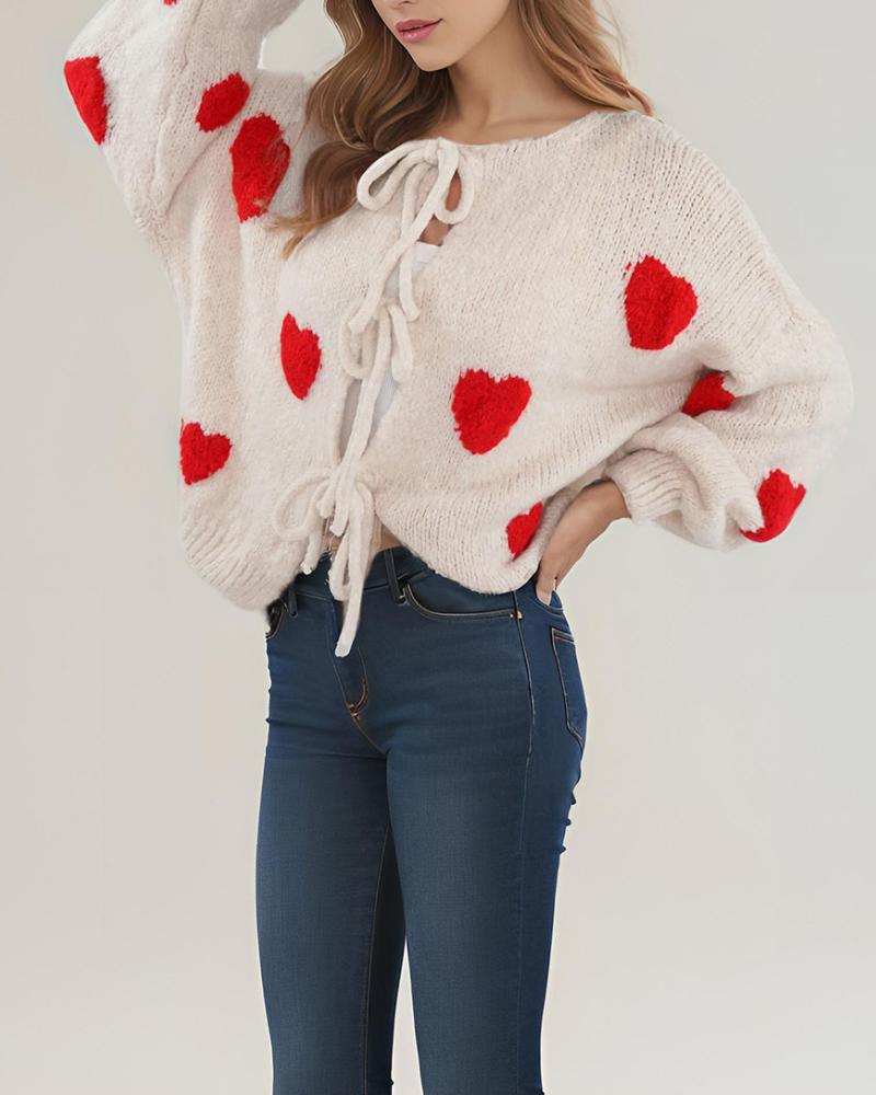 Heart Pattern Long Sleeve Round Neck Tied Detail Cardigan Spring Winter Top