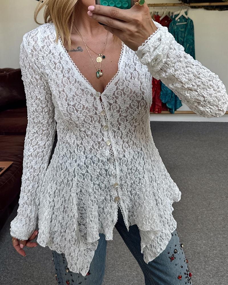 Lace V Neck Pearl Button Decor Blouse Elegant Asymmetrical Ruffles Cardigan Top