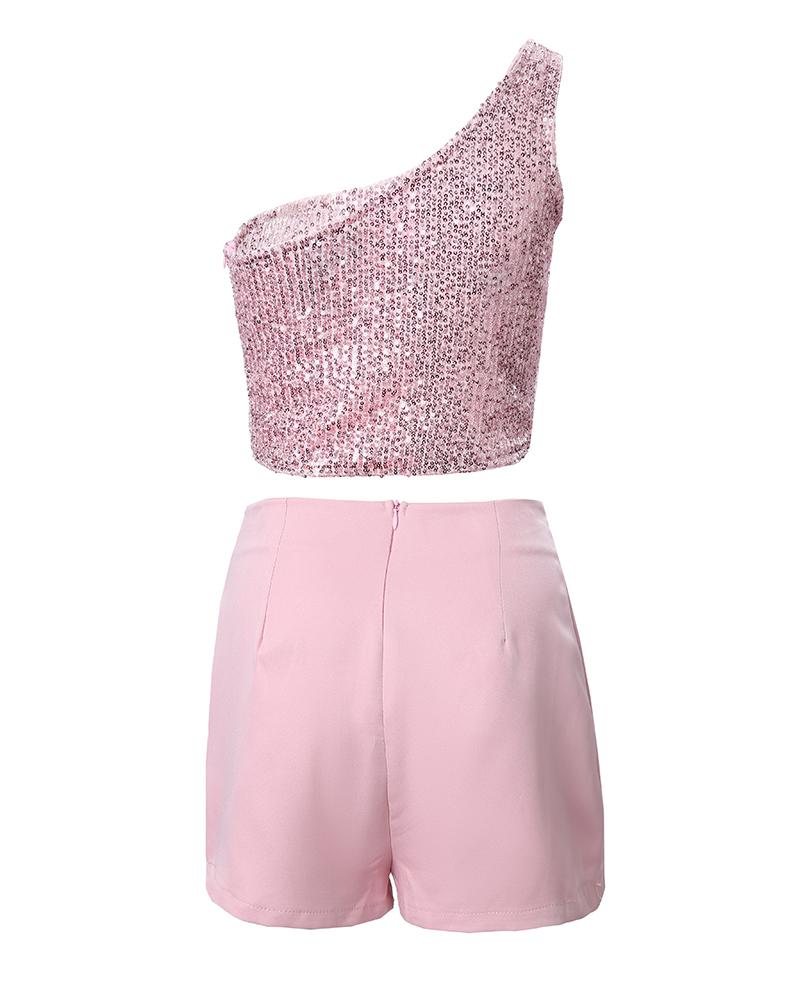 One Shoulder Sequin Crop Top & Skorts Set