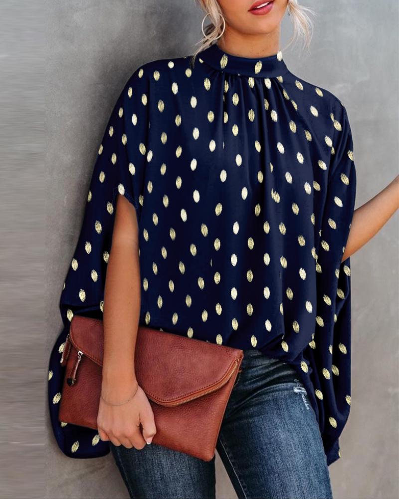 Polka Dot Stand Collar Batwing Sleeve Blouse Casual Back Tied Detail Top