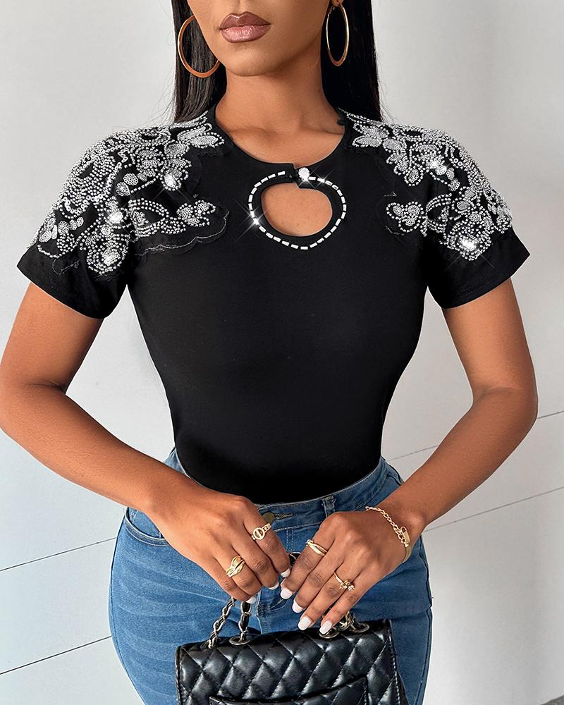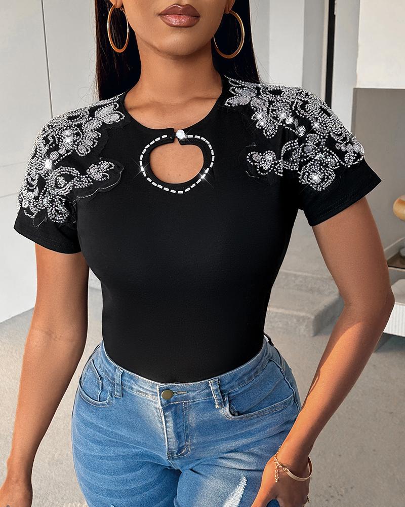 Rhinestone Floral Pattern Hollow Out T Shirt