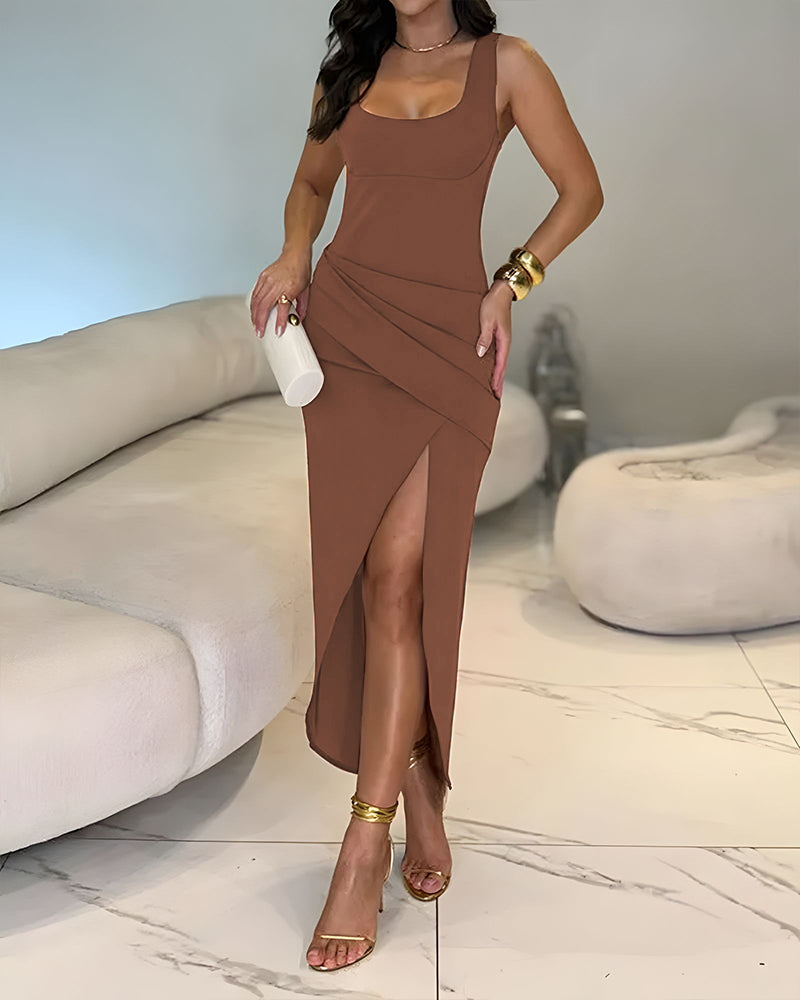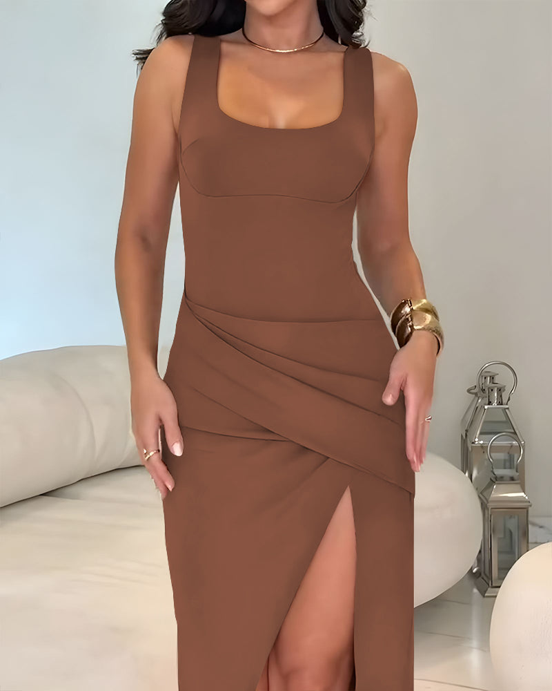 Sexy Square Neck Thick Strap Backless Slit Dress