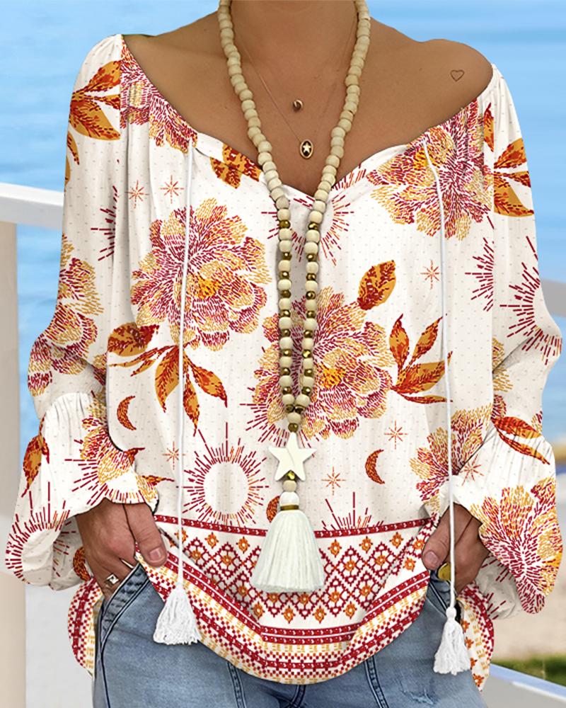 Tribal Print Tassel Design Lantern Sleeve Shirred Blouse Casual Top