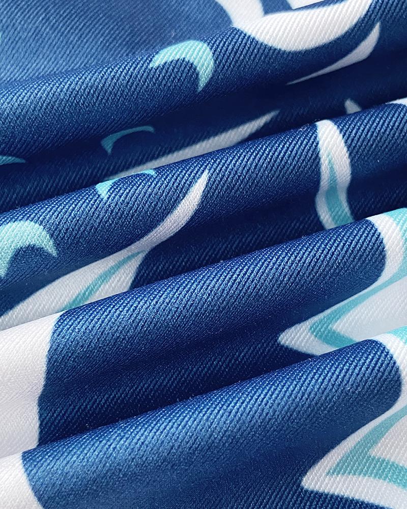 Tropical Print Plunge V Neck Waist Cutout Boho Maxi Dress Three Quarters Tied Detail Elastic Waist Back Vacation Dress