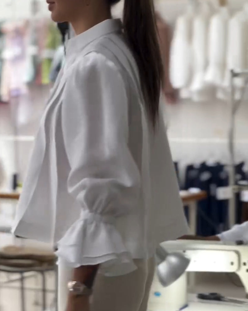 Turn down Collar Puff Sleeve Loose Blouse Casual Pleated Linen Crop Top