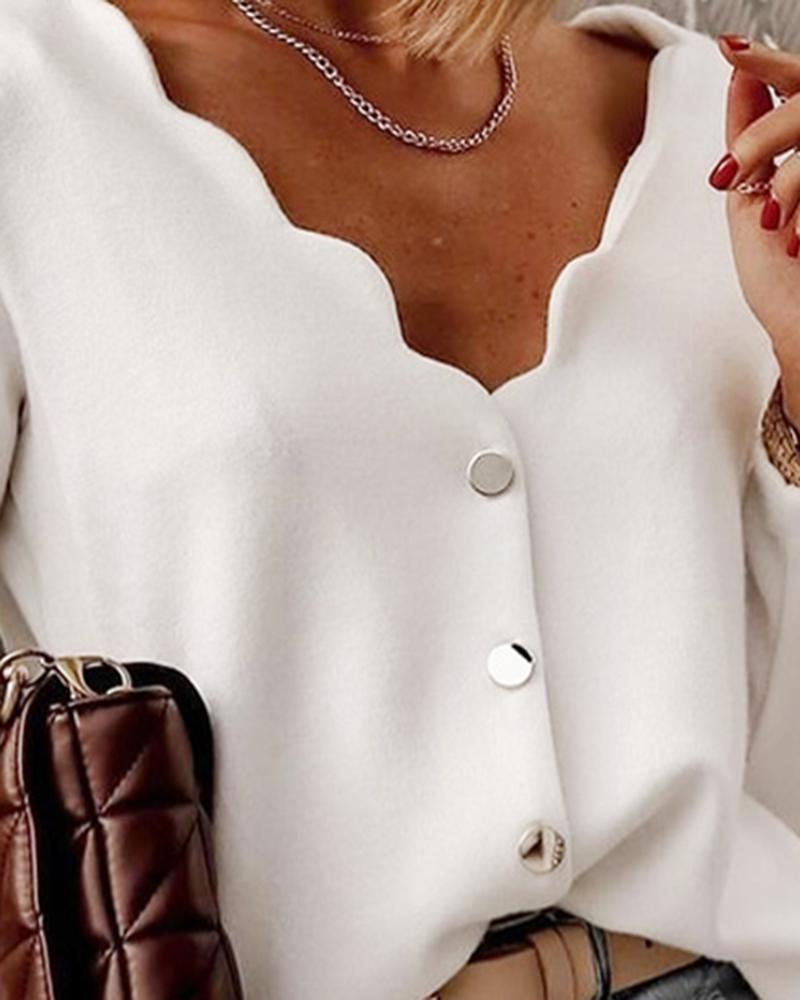 V Neck Long Sleeve Front Button Cardigan Scallop Design Casual Top