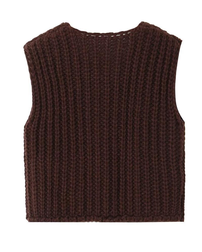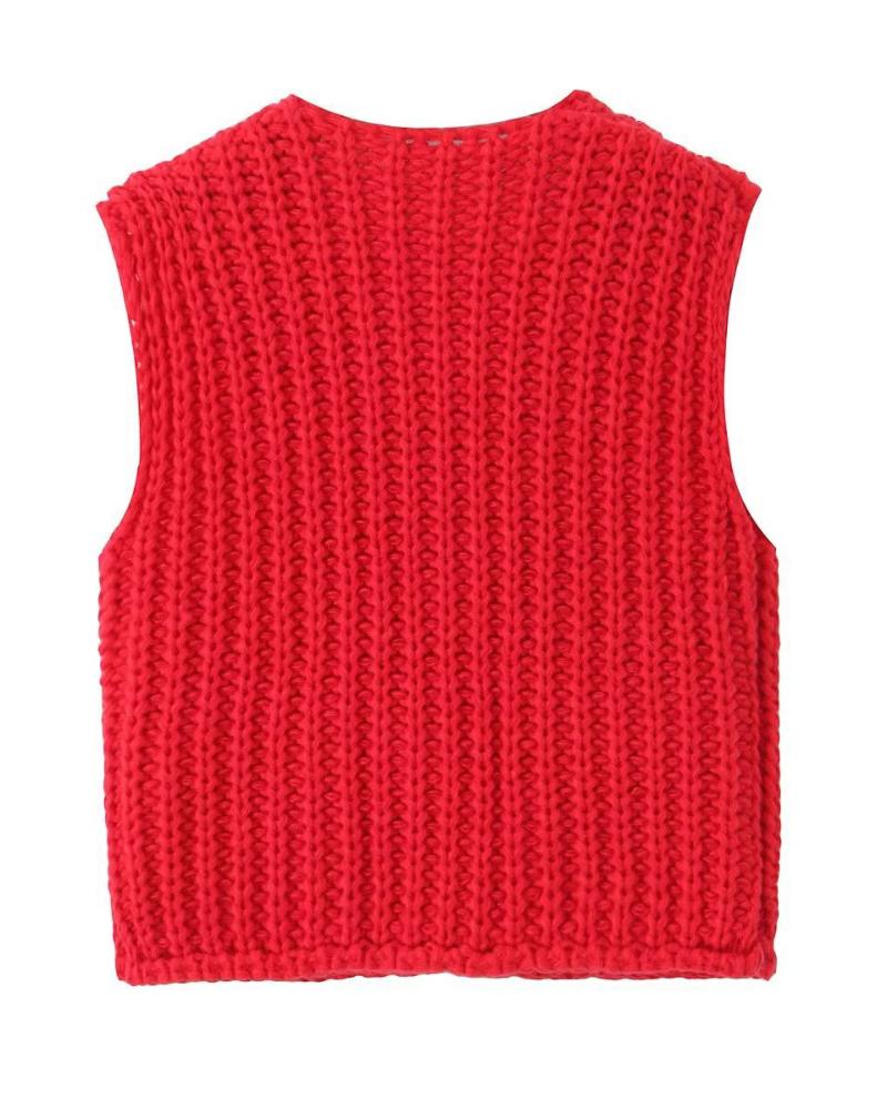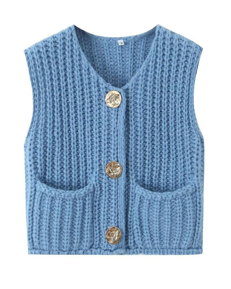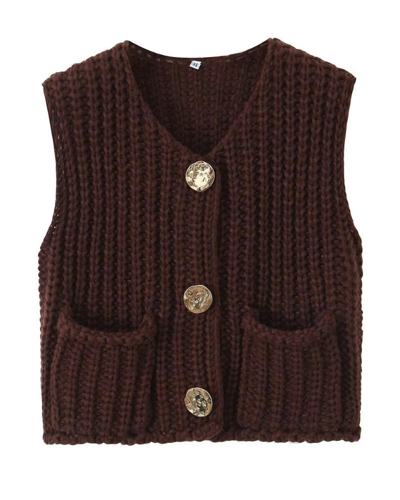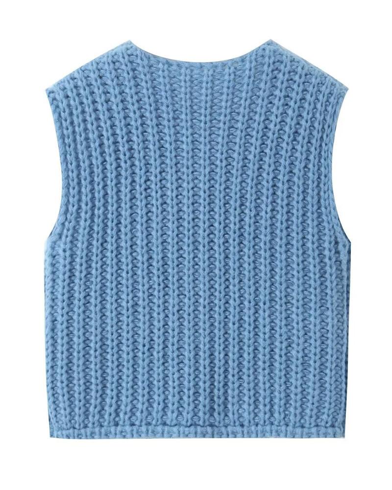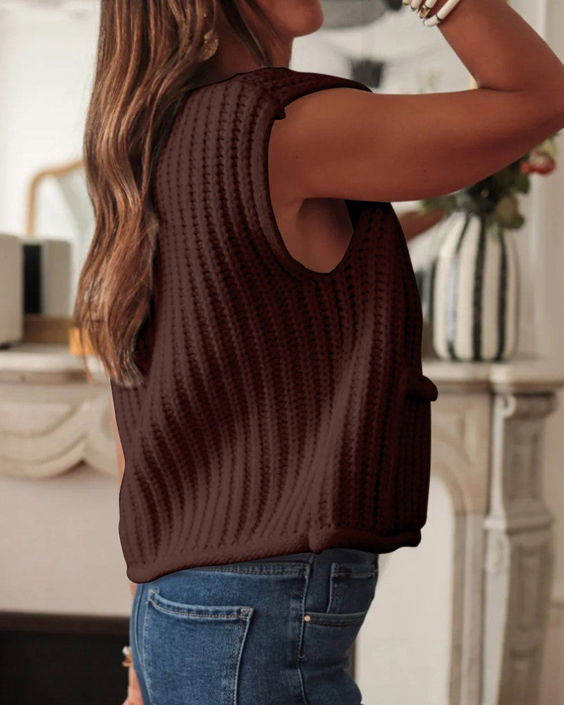 V Neck Sleeveless Button Front Knit Vest Casual Loose Fit Sweater Top with Pockets