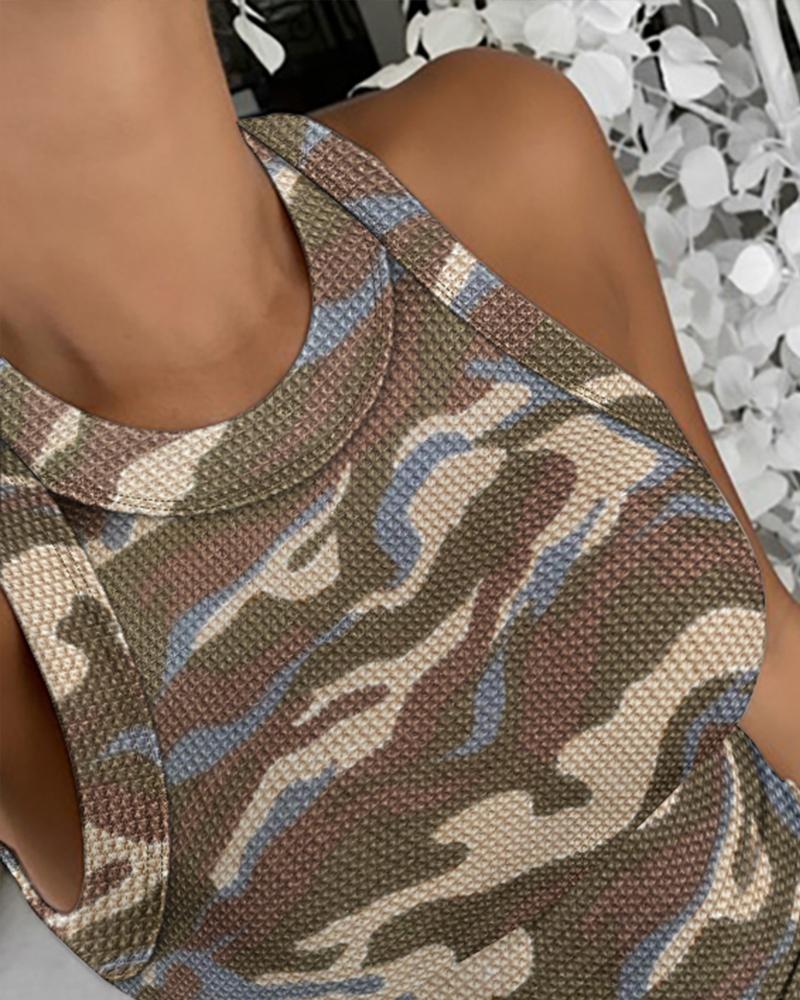 Waffle Knit Camouflage Print Round Neck Sleeveless Tank Slim Fit Casual Top