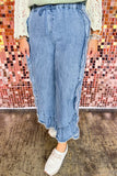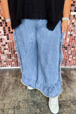 Blue Plus Size Lace up Waist Ruffled Trim Ankle Length Jeans