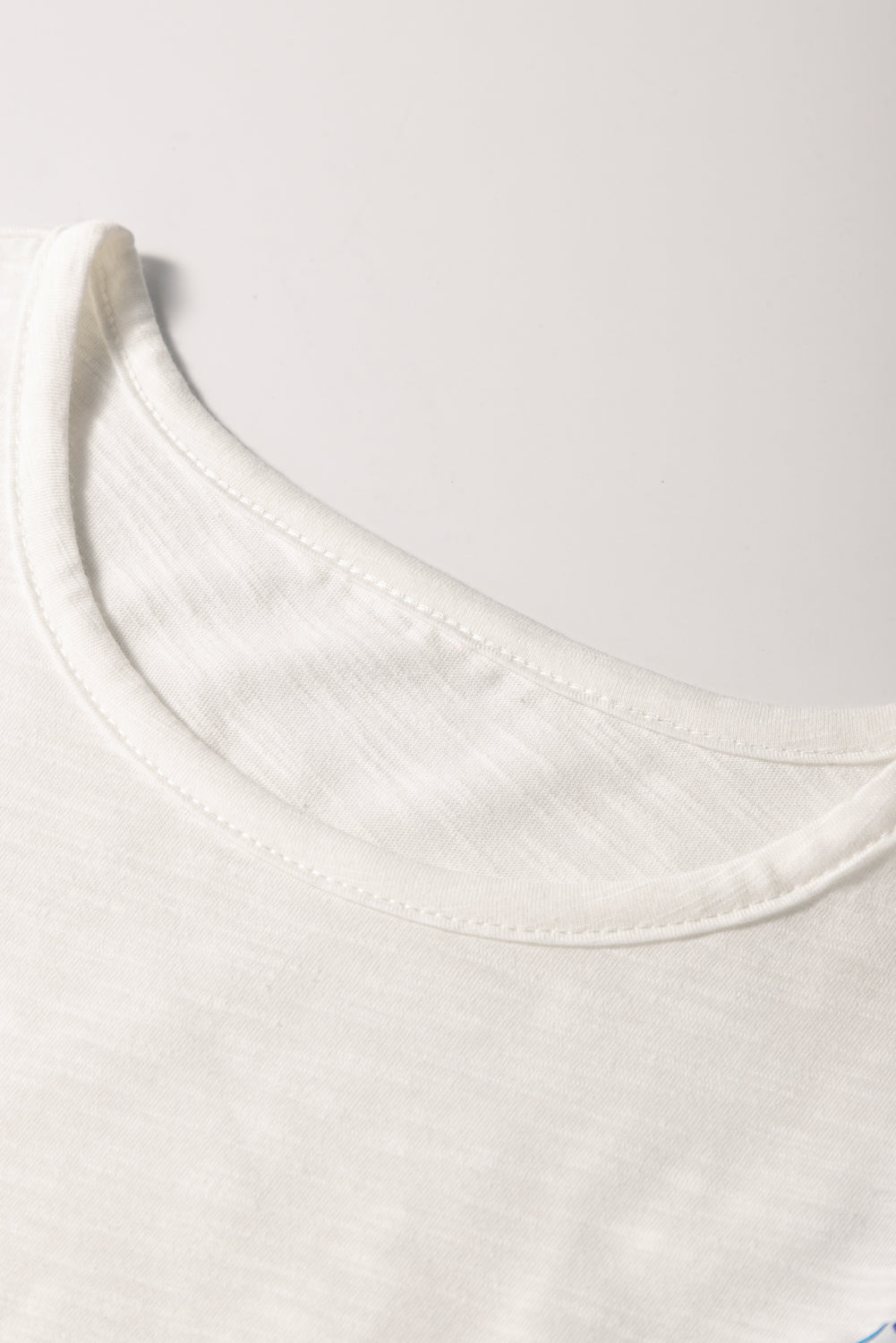 Blue Ricrac Trim Printed Flutter Sleeve Contrast Patchwork Blouse