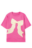 Strawberry Pink Contrasting Color Ribbon Bow Front Patch Loose Tee with Slits