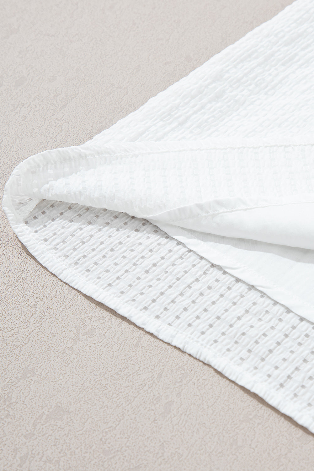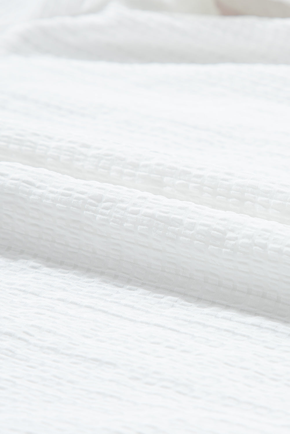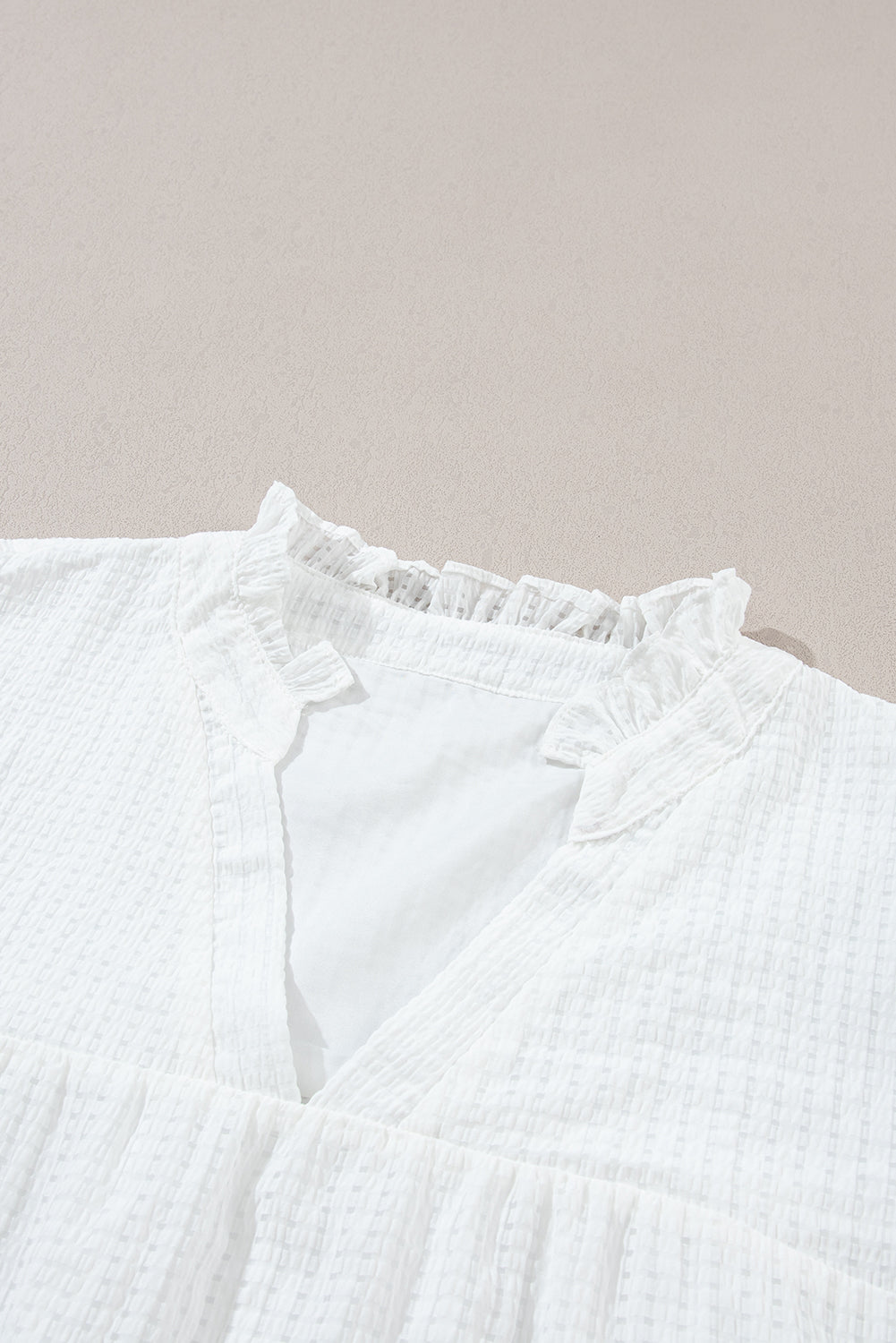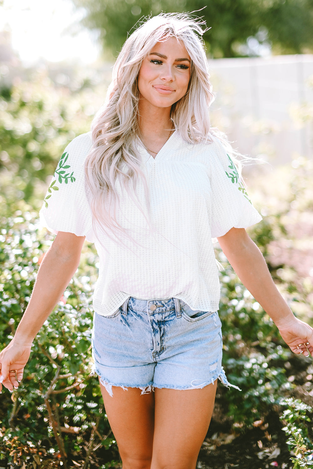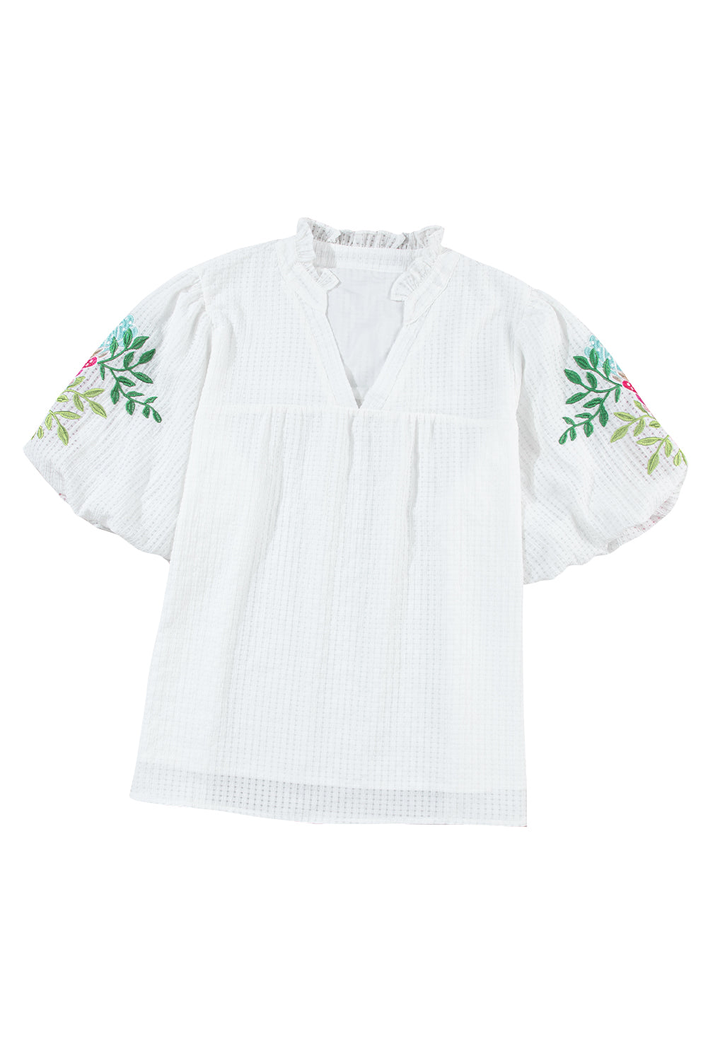 White Floral Embroidered Puff Sleeve Notched Neck Blouse