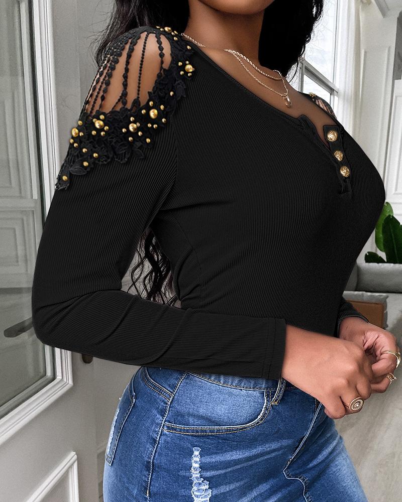 Knit Cold Shoulder Slim Fit Long Sleeve Beaded Chain Tee Casual Top