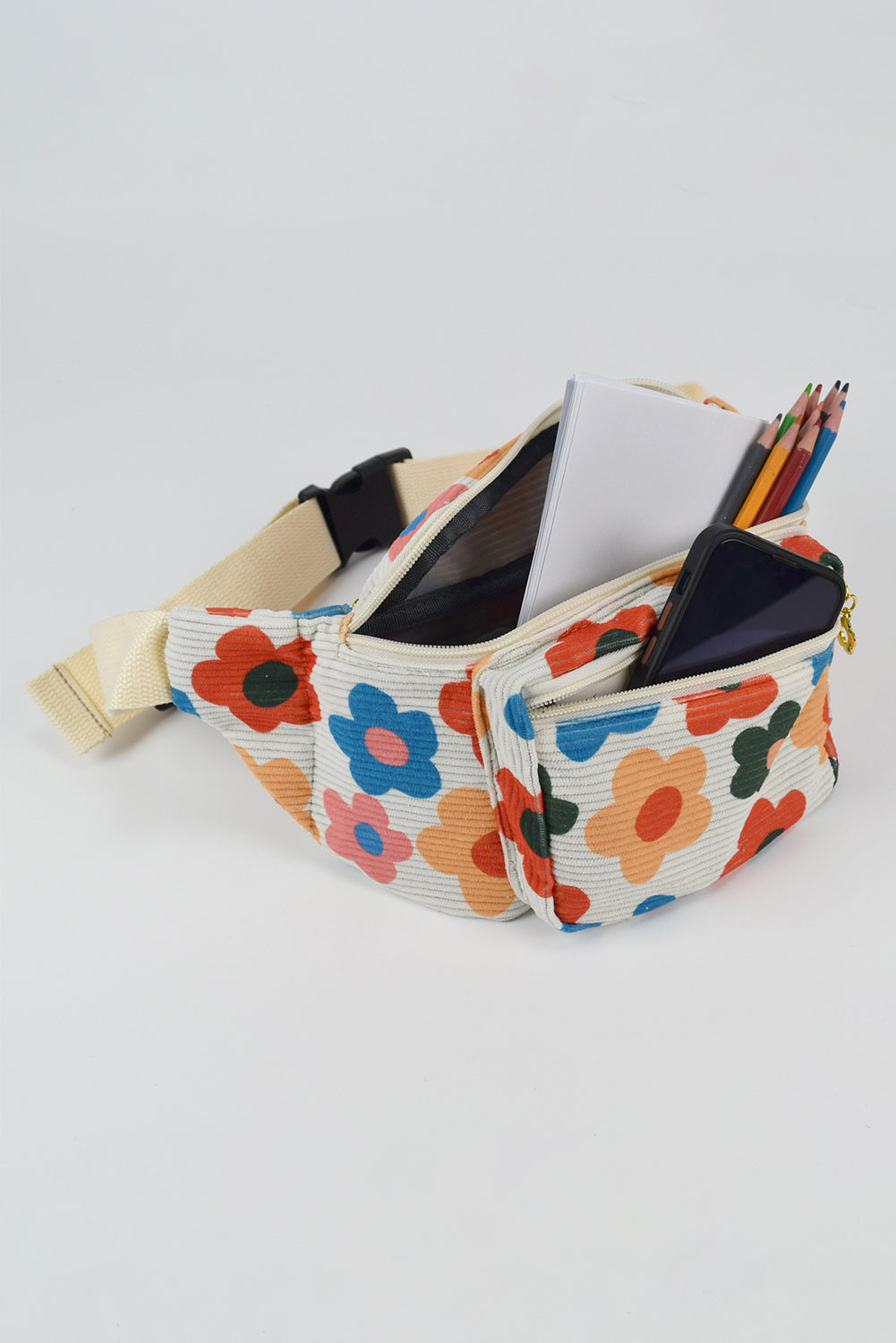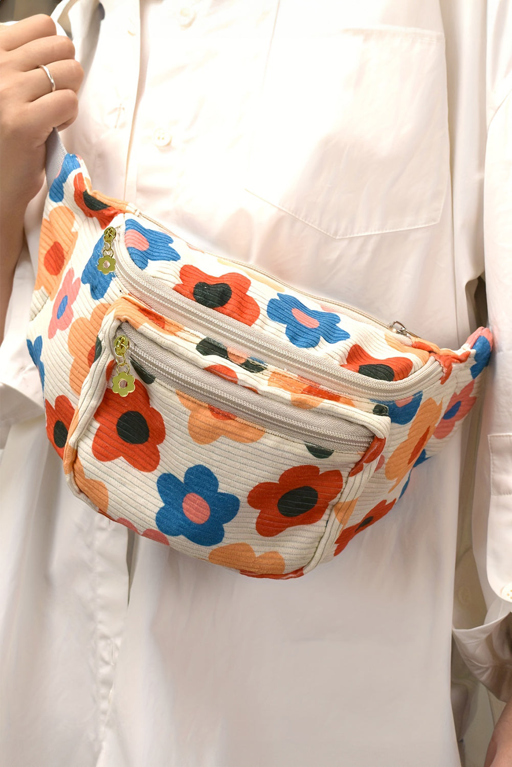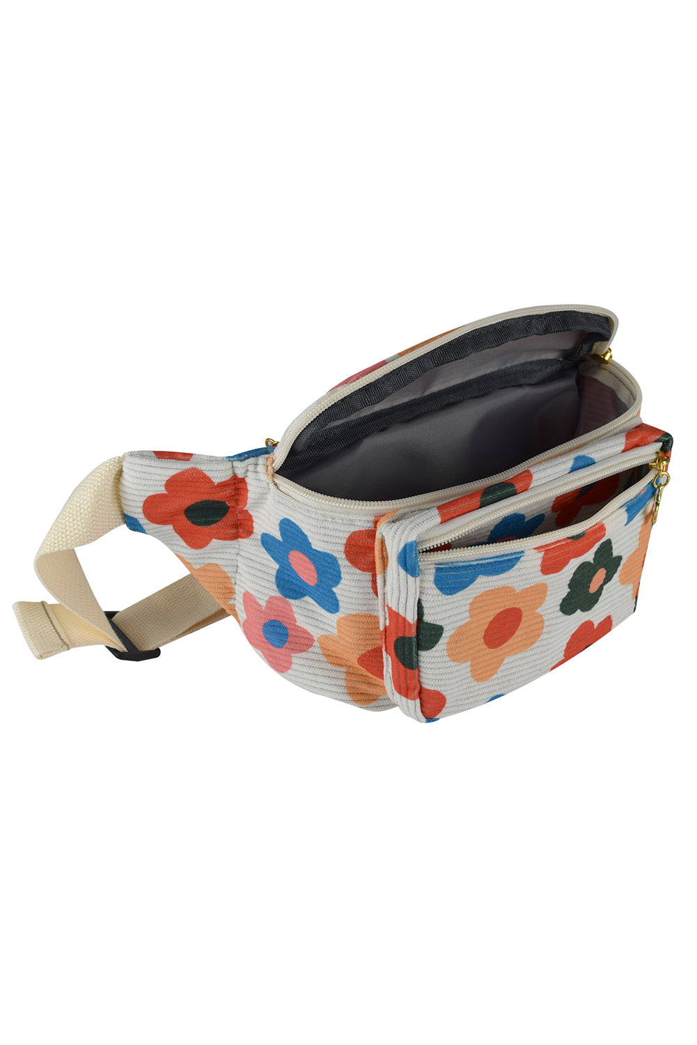 Khaki Floral Print Buckle Wide Strap Corduroy Crossbody Bag