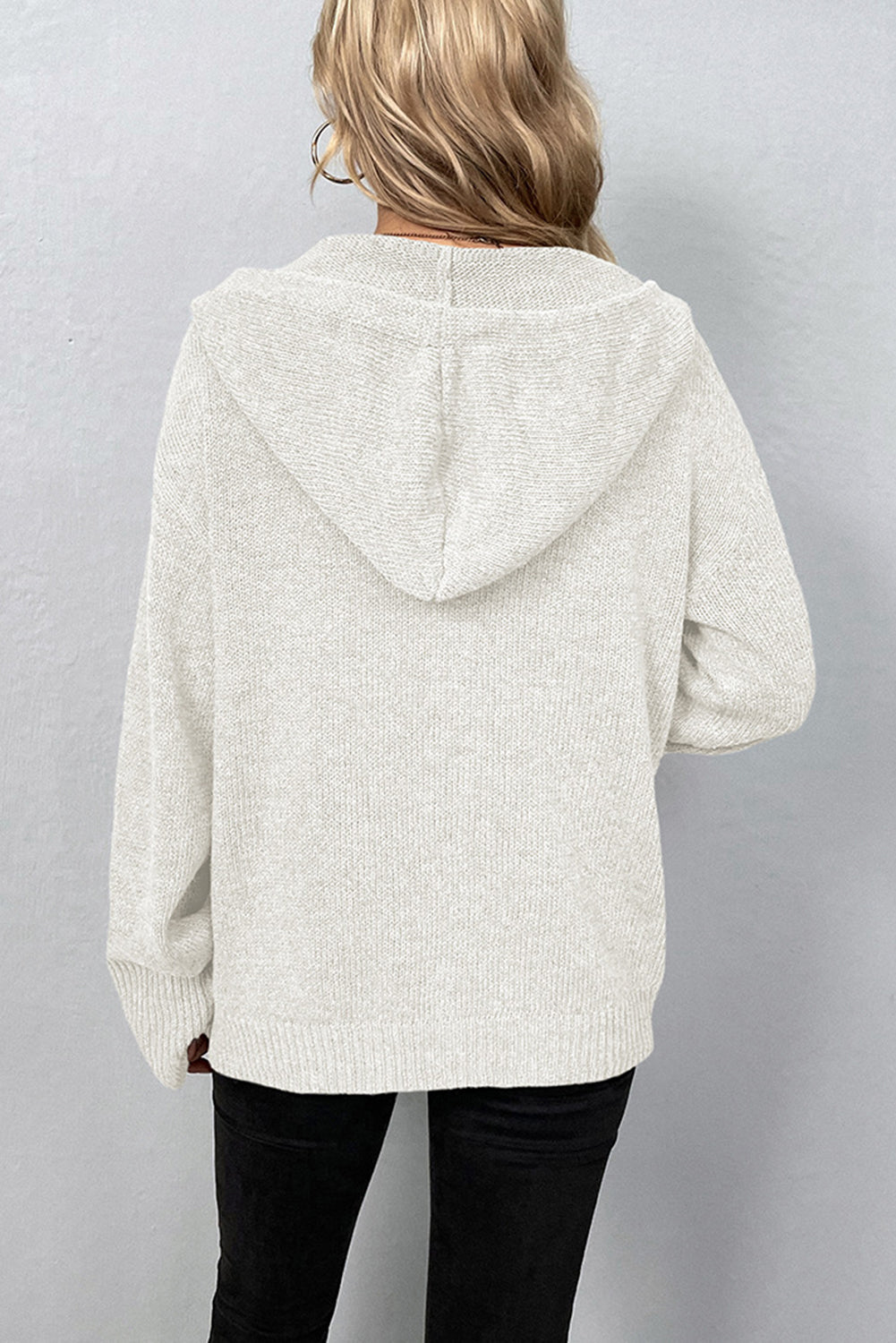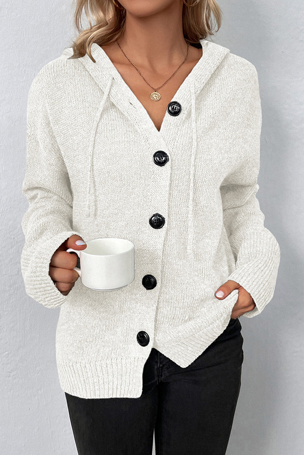 White Drawstring Hooded Button Up Drop Shoulder Sweater Cardigan