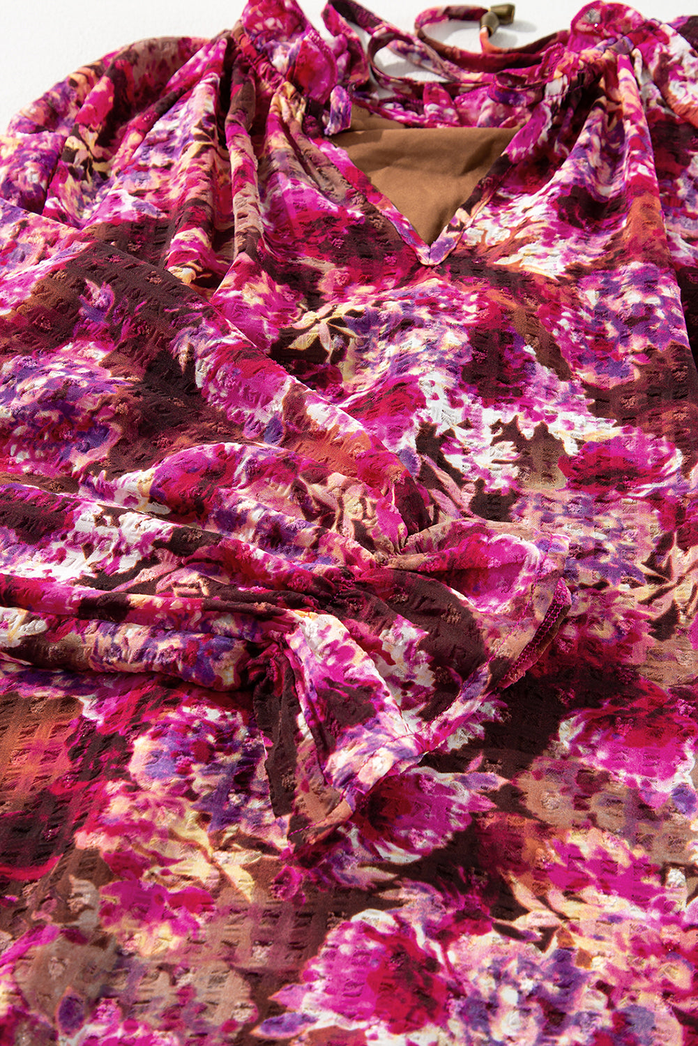 Rose Red Floral Allover Print Drawstring Ruffled V Neck Loose Blouse