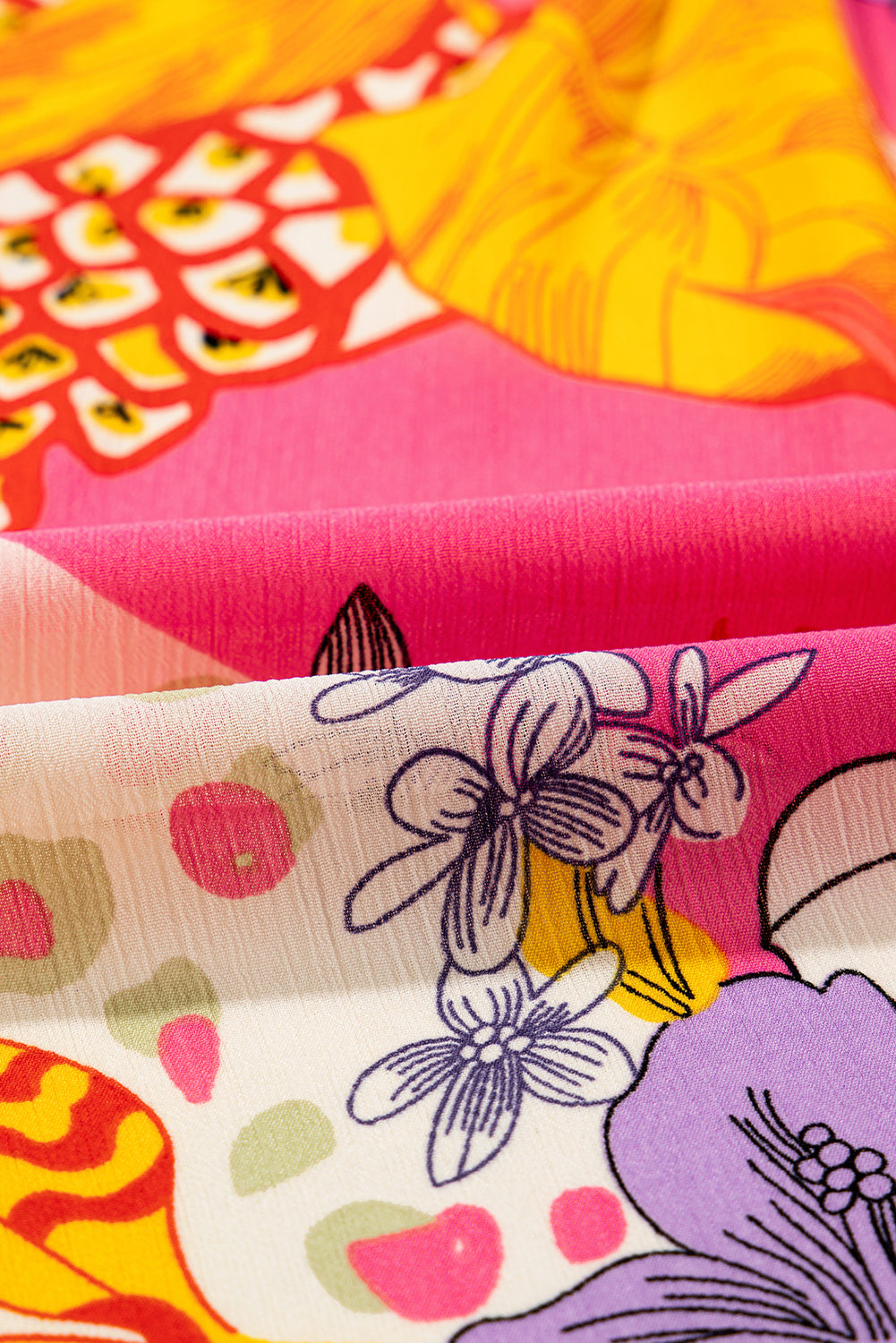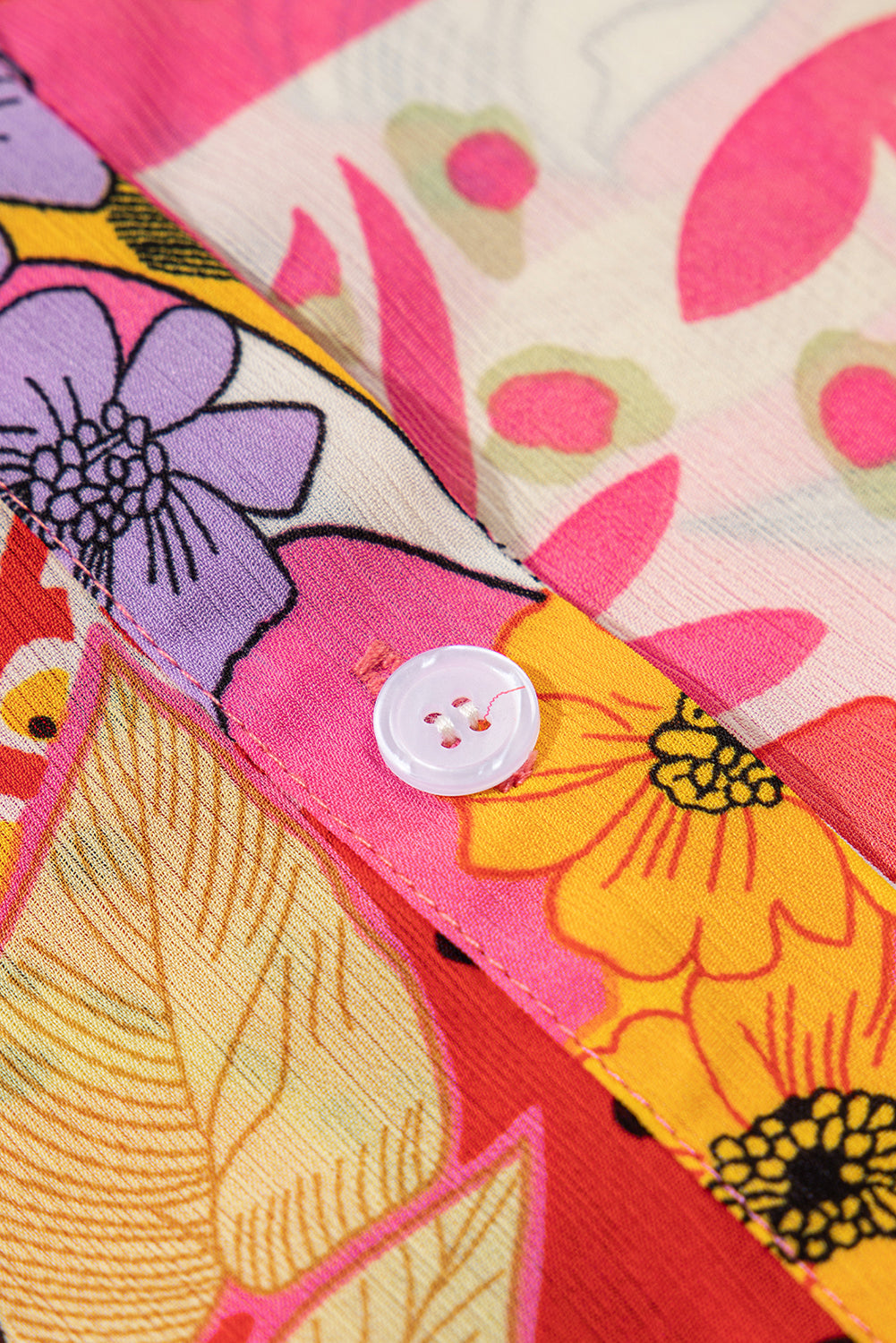 Red Abstract Floral Print Buttoned Ruffled Bubble Sleeve Shirt