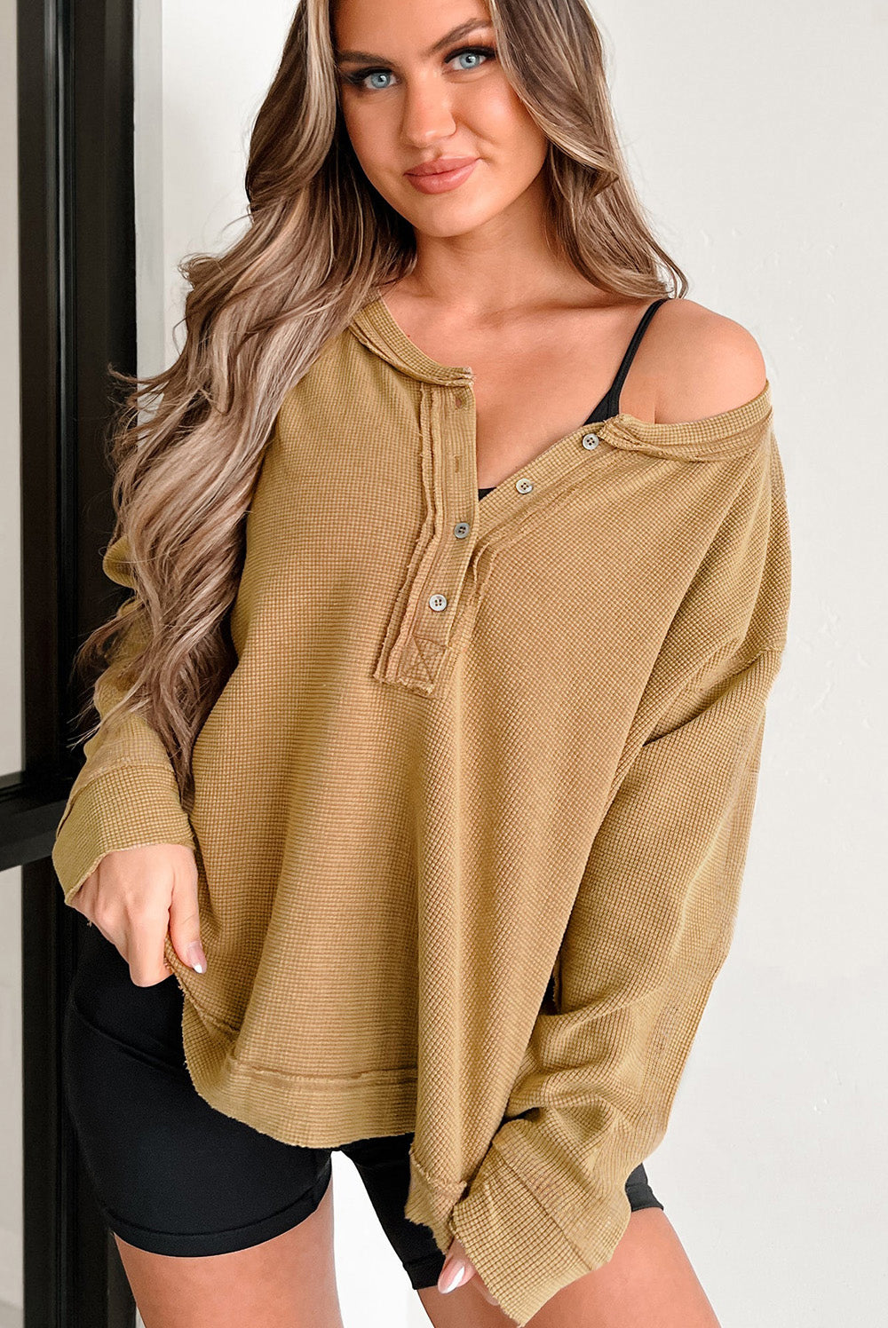 Camel Textured Knit Half Button Drop Shoulder Oversized Top