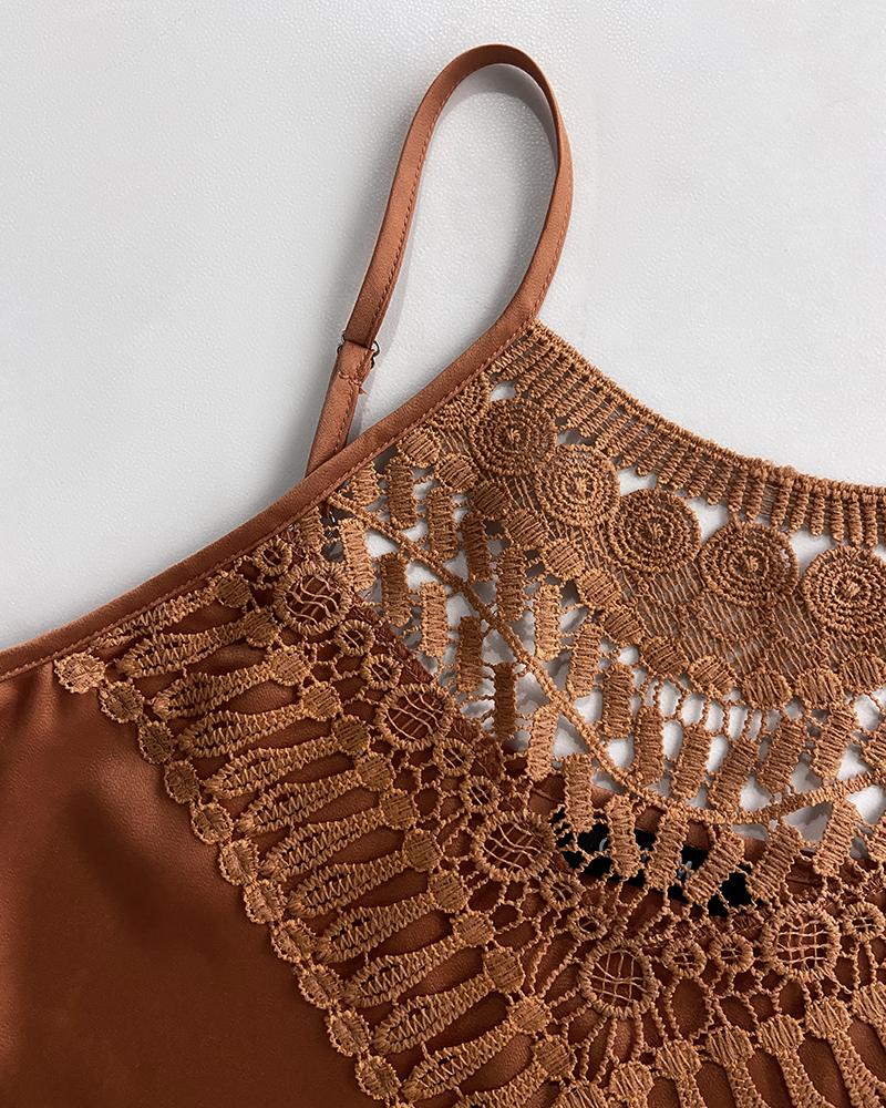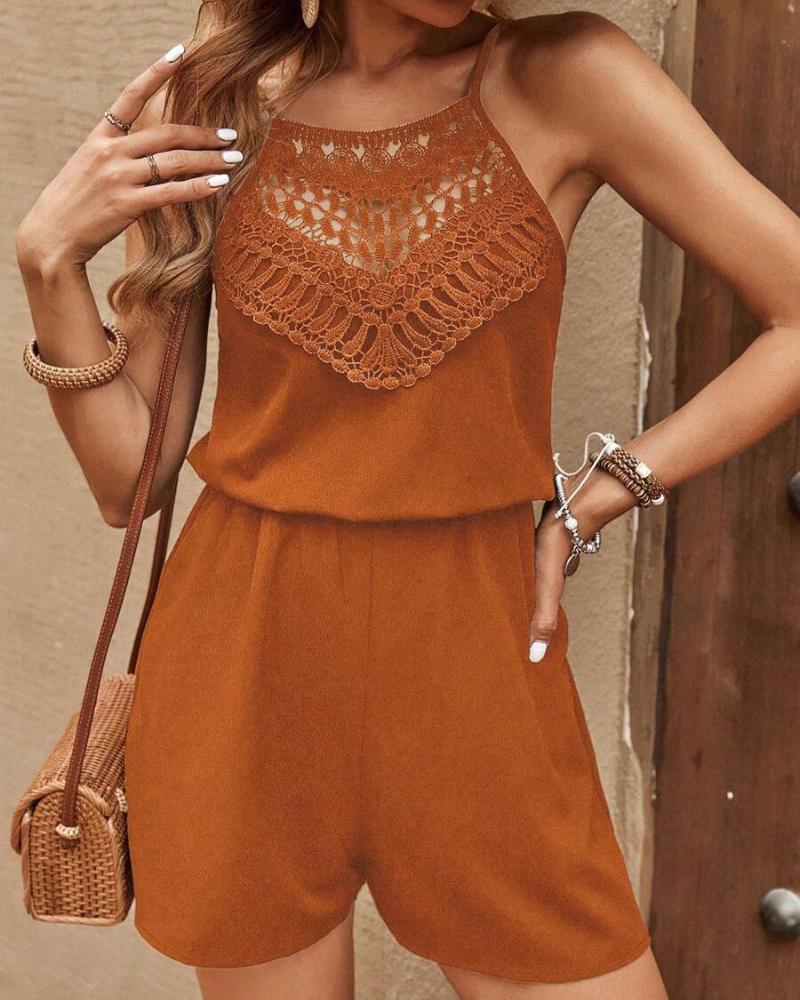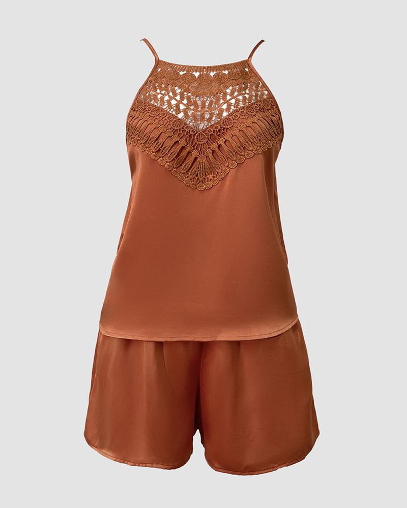 2 Pieces Outfit Guipure Lace Patch Spaghetti Strap Tank and Casual Pocket Design Shorts