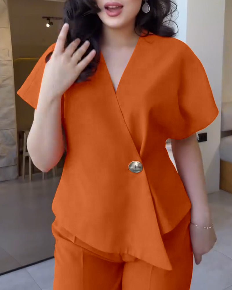 2 Pieces Outfit Overlap V Neck Bell Sleeve Single Button Front Asymmetrical Hem Top and Casual Wide Leg Pants Set