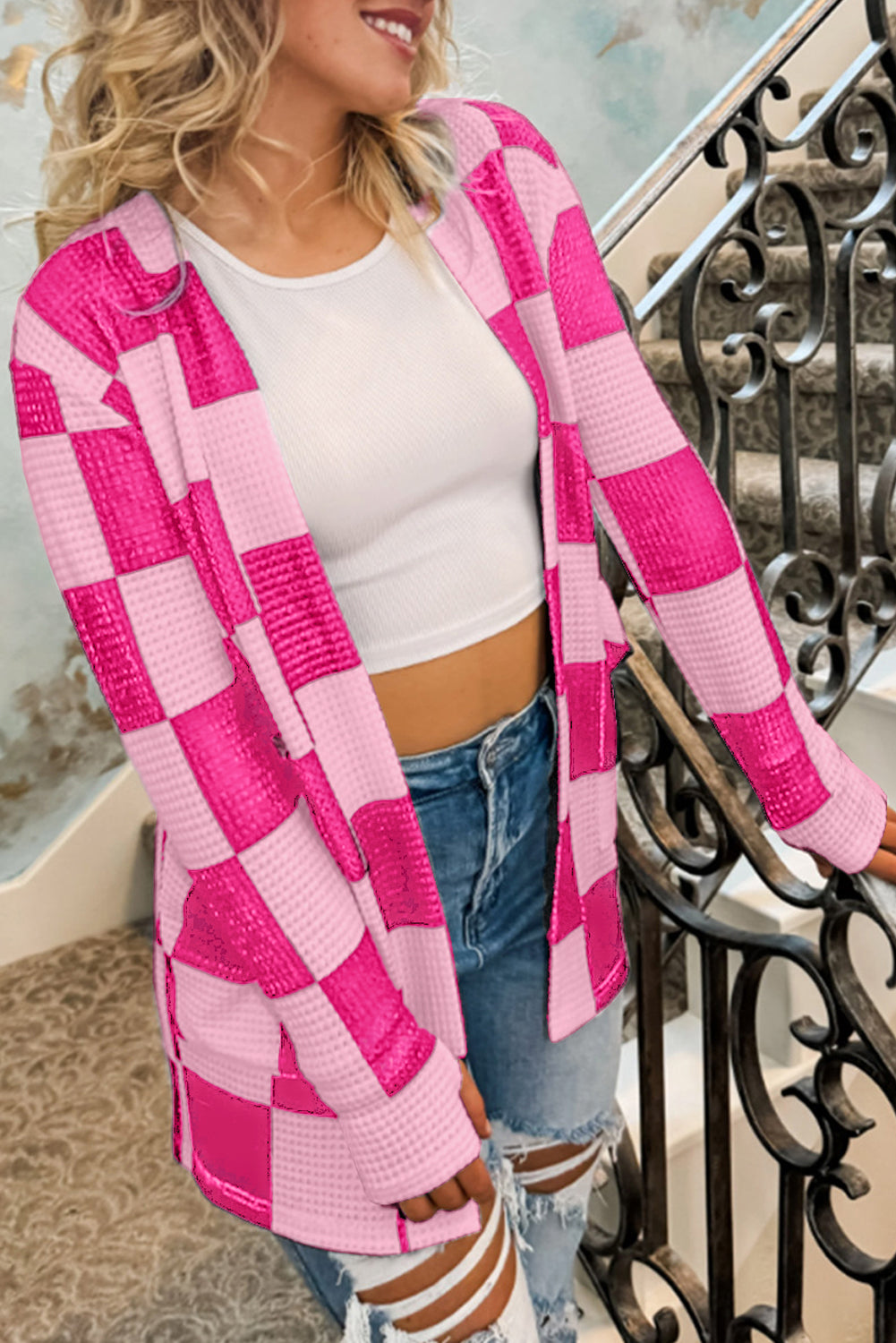 Black Checkered Waffle Knit Thumbhole Open Front Cardigan