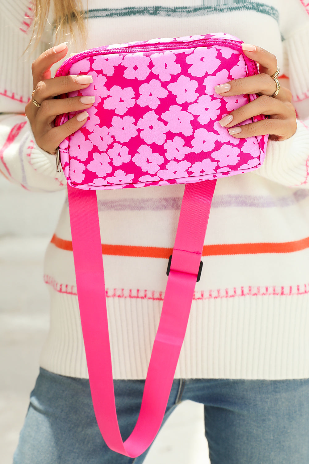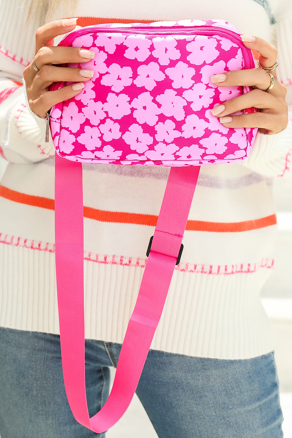 Rose Red Flower Print Wide Belt Buckle Zipper Crossbody Bag